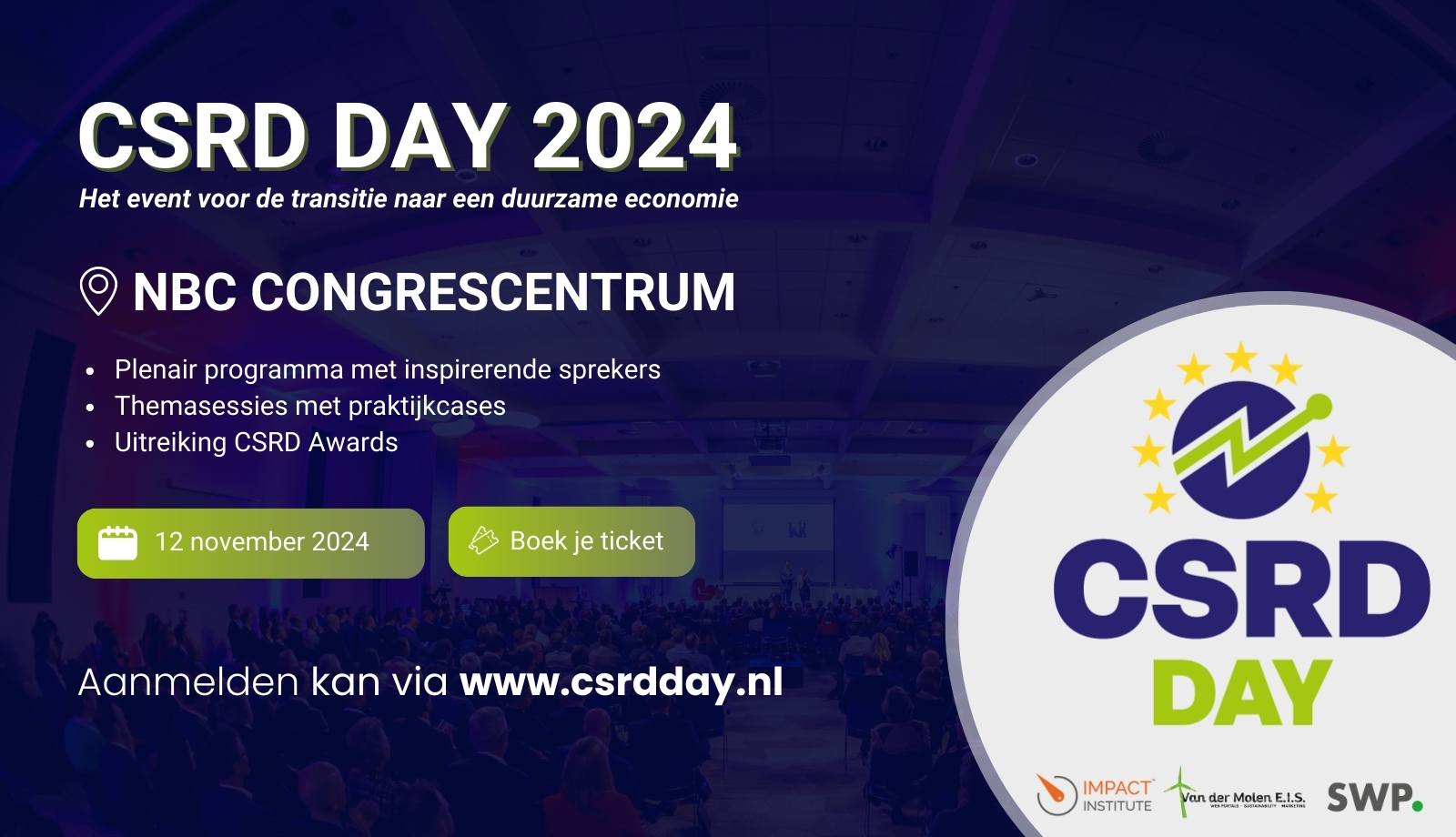 Op 12 november 2024 wordt de eerste editie van een nieuw jaarlijks duurzaamheidscongres georganiseerd: CSRD DAY. Tijdens CSRD DAY worden de Nederlandse CSRD Awards uitgereikt. CSRD DAY is een initiatief van Impact Institute, Van der Molen E.I.S. en SWP. Keynote sprekers zijn onder meer Laura van Geest (voorzitter AFM), Jan Peter Balkenende, Dick de Waard en Wim Bartels.