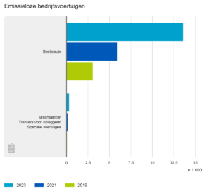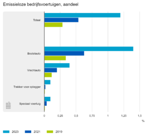 In 2021 werd 0,3 procent van de totaal afgelegde kilometers door Nederlandse bedrijfsvoertuigen gereden door emissieloze voertuigen. In totaal gaat het om 79,8 miljoen kilometer. Voor vrachtvoertuigen was dit 0,02 procent (2,0 miljoen kilometer) en voor bestelauto’s 0,4 procent (77,8 miljoen kilometer).