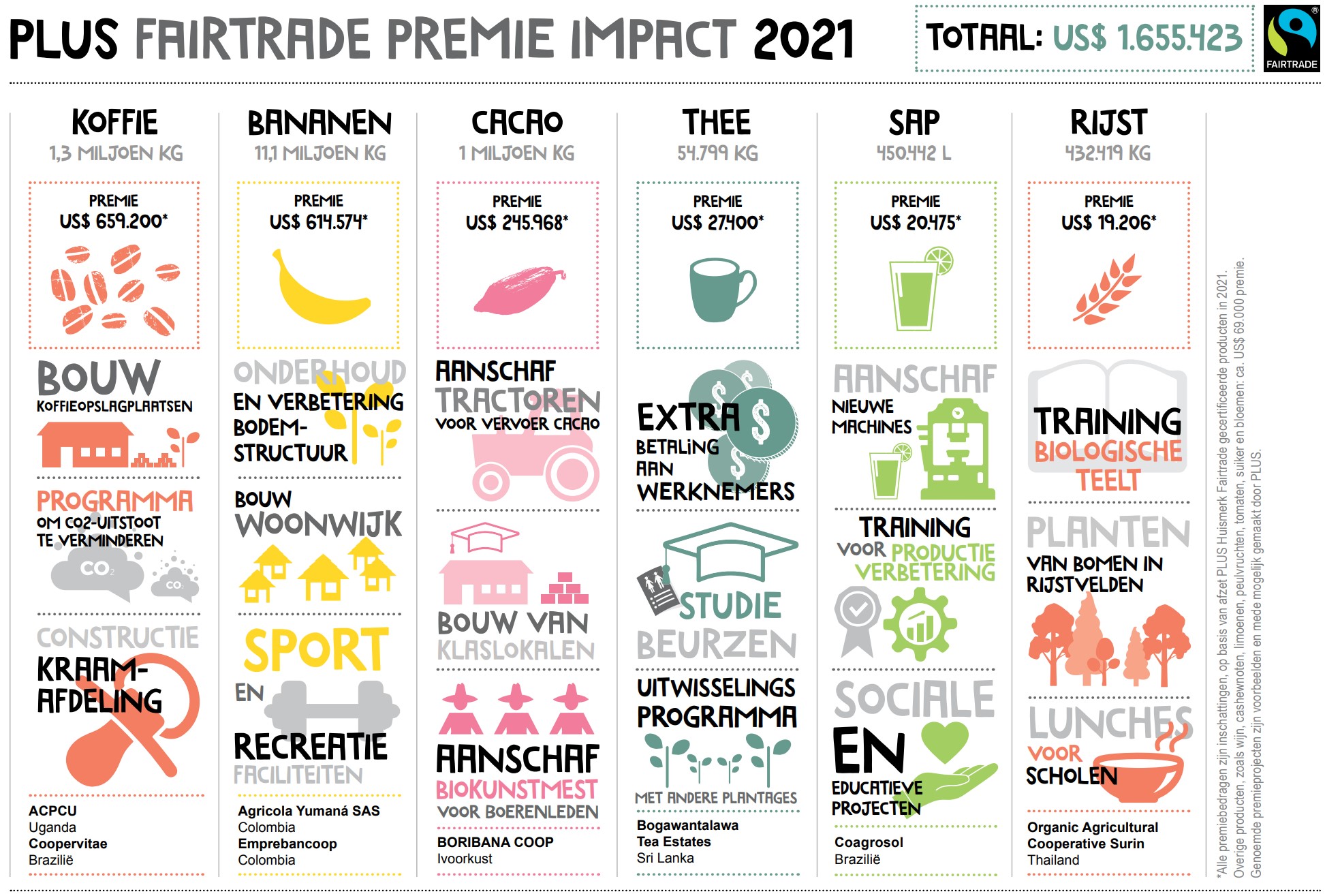 Alle huismerk koffie en thee is 10 jaar Fairtrade gecertificeerd en nu ook klimaatneutraal. Door de verkoop van Fairtrade producten draagt de supermarkt elk jaar Fairtrade premie af. Dat levert mooie cijfers op. Klanten van PLUS hebben de afgelopen 10 jaar bijna 10 miljoen kilo koffie gekocht. Dat zijn 2.000.000 pakken koffie (van 500 gram) waarmee 133.000.000 kopjes koffie zijn gezet. Hierdoor heeft PLUS alleen al door de verkoop van haar huismerk koffie, ruim 5 miljoen US dollar aan Fairtrade premie gegenereerd. Daarnaast hebben klanten voor 767.327 kilo aan thee gekocht en daarmee 383.663.500 kopjes thee gezet. Hierdoor is er nog eens 383.667 US dollar aan Fairtrade premie afgedragen. Alles bij elkaar opgeteld levert 10 jaar koffie en thee verkoop een bedrag van ruim 5,5 miljoen US dollar aan afgedragen Fairtrade premie op.