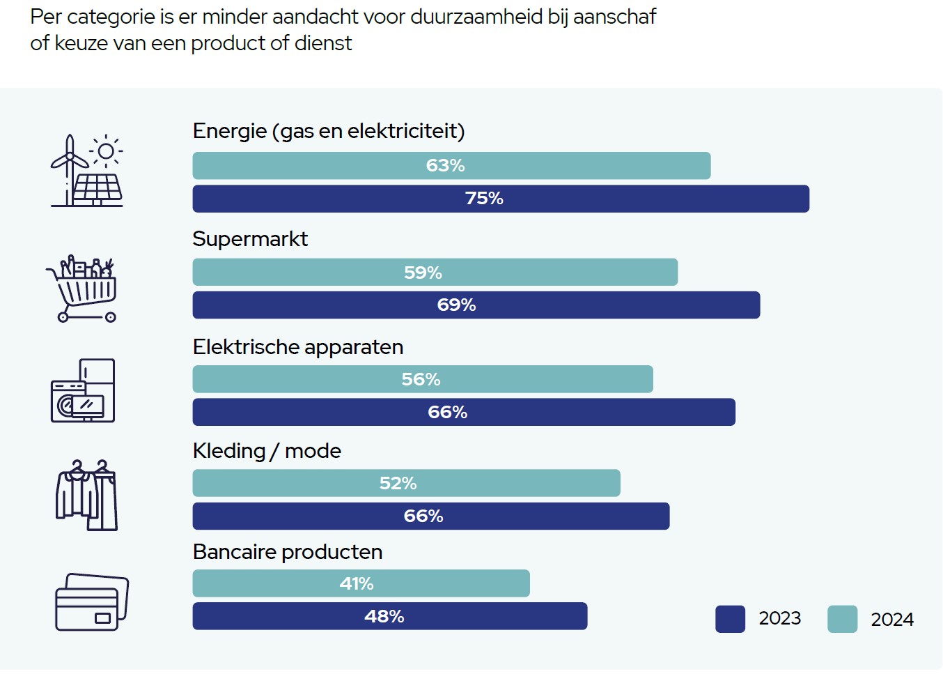 Voor het eerst heeft de consument minder aandacht voor duurzaamheid bij aankoopbeslissingen. Bij diverse duurzaamheidsthema’s, zoals milieu, biodiversiteit, eerlijke handel, plasticverbruik en lokale productie is sprake van een forse daling van circa 5% ten opzichte van 2023. Ook is in alle onderzochte productcategorieën, met uitzondering van auto’s, het belang dat men bij aankoop hecht aan duurzame aspecten teruggelopen. In de categorie energie is dit belang zelfs met 12% gedaald ten opzichte van vorig jaar.