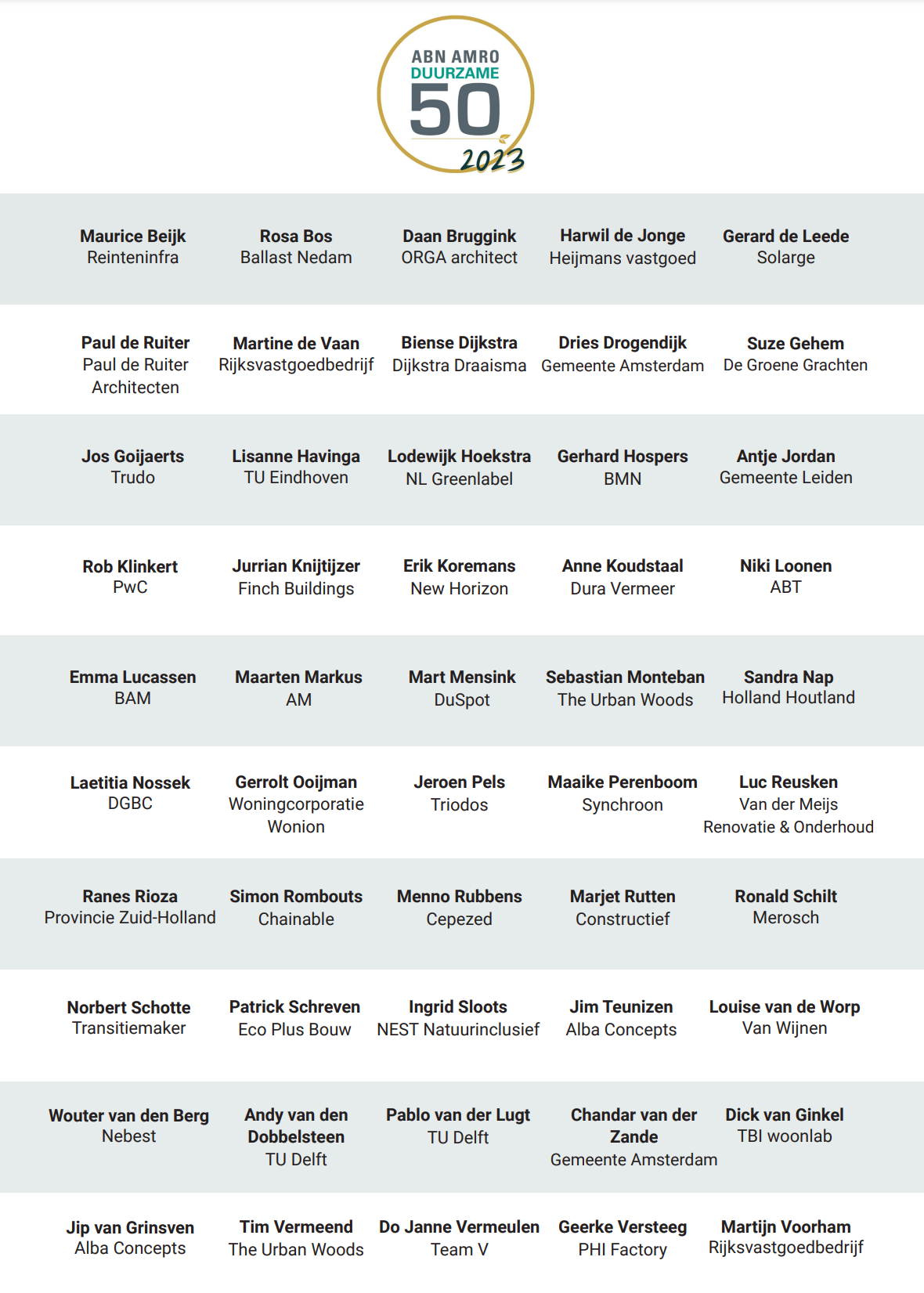De ABN AMRO Duurzame 50 is de jaarlijkse thermometer voor duurzaamheid in de bouw en vastgoed in Nederland. De lijst weerspiegelt wat er het afgelopen jaar is gebeurd op het gebied van duurzaamheid in de bouw- en vastgoedsector. Ieder jaar vraagt de vakjury zich af wat de belangrijkste vraagstukken en trends zijn en welke mensen daar het meest aan bijdragen. Wie zijn de koplopers, maken meters, zetten de agenda, werken samen en brengen creativiteit en vernieuwing in? Wie zijn die mensen die over genoeg daadkracht, charisma, contacten, kennis en visie beschikken om de gebouwde omgeving ook echt duurzamer te maken?