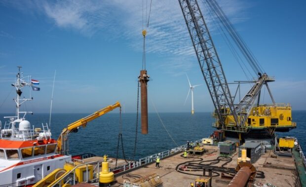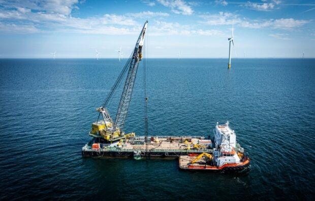 - Luchtfoto van de installatie werkzaamheden in windpark Hollandse Kust Zuid, 18 km uit de kust van Scheveningen