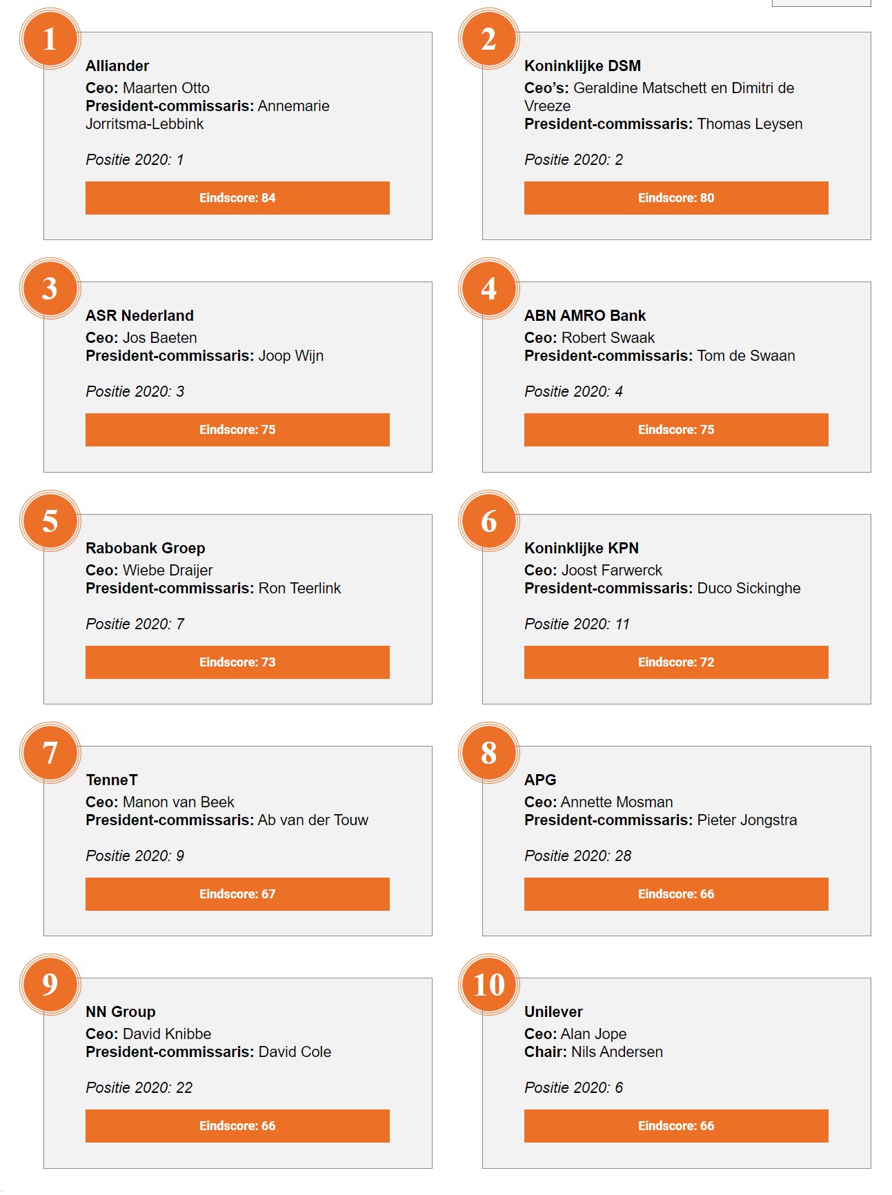 De honderd grootste organisaties in Nederland worden in de index beoordeeld op vijf pijlers. De top-20 wordt in Management Scope gepubliceerd en toont zich een diverse groep van organisaties met een voortrekkersrol in Nederland.