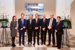 Foto: Van links naar rechts: Marine Condette (AACSB), Prof. dr. Steven De Haes (decaan Antwerp Management School), Prof. dr. Herman Van Goethem (rector Universiteit Antwerpen), Jacques Vandermeiren (CEO Port of Antwerp), Eddy Annys (COO Randstad Belgium), Jan Remeysen (CEO BASF), Prof. dr. Wayne Visser (AMS Chair on Sustainable Transformation)