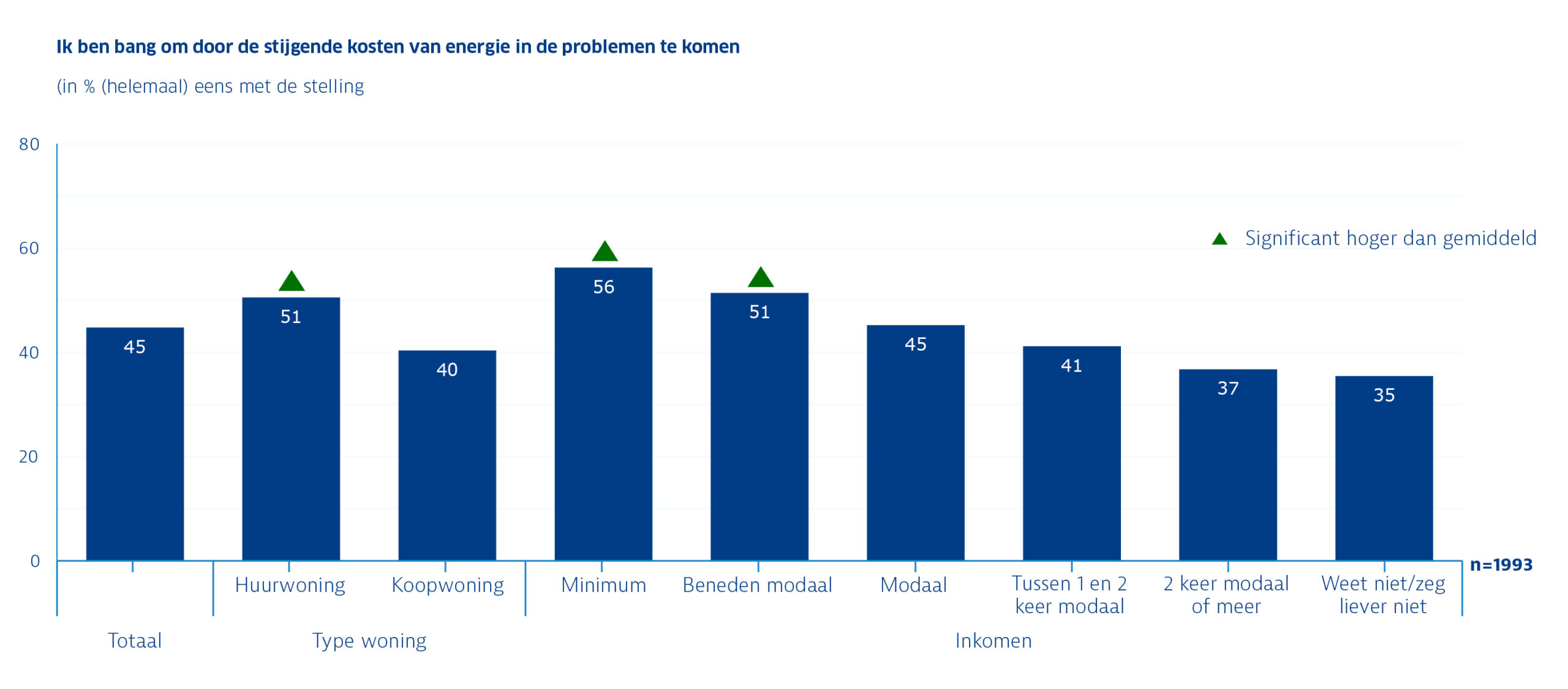 Veel Nederlanders maken zich zorgen over stijgende energiekosten. Deze zorgen over betaalbaarheid leven breed: niet alleen onder huishoudens met een minimum of beneden modaal inkomen, maar ook bij bijna de helft van de modale inkomensgroep. Geld blijkt zowel de grootste stimulans als de grootste belemmering in de energietransitie. Vooral mensen met een lager inkomen of een huurwoning voelen zich buitengesloten van duurzame oplossingen, terwijl juist zij het meest geraakt worden door hogere energiekosten.
