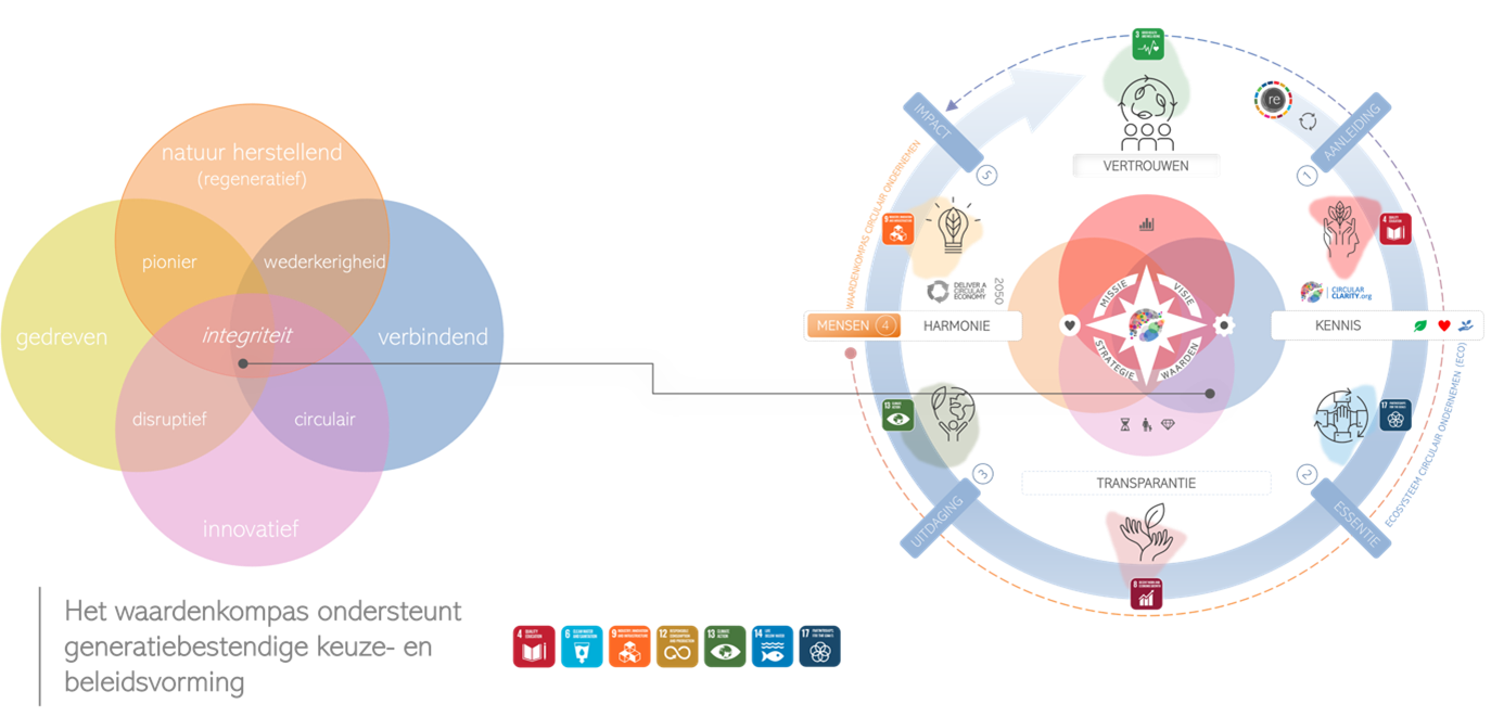 Integriteit nastreven begint met het verankeren van de kernwaarden van TinyOcean door middel van het Waardenkompas, ontwikkeld door Circular Clarity. Dit Waardenkompas wordt gebruikt als stuurmiddel om in alle (externe) ontwikkelingen integriteit te borgen.