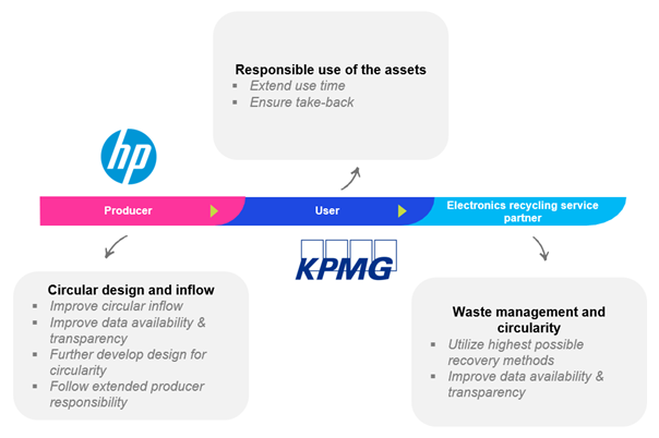 Becoming more circular can include designing for reuse and repair, using recycled materials, buying refurbished equipment, and more. However, the complexity of going circular lies in the long and complex supply chains, making it difficult to know where to start and what the key levers for impact are. Moreover, the concept of circular economy is still relatively nascent and unfamiliar to many companies. What is clear is that a transition to circularity requires collaboration across the supply chain. That is why KPMG, HP and our electronics recycling service partner joined forces to obtain actionable insights needed for the circular transition of a highly tangible asset – laptops. HP, for example, applies rigorous design principles to improve the environmental performance of their products throughout their life cycle, driving the circularity of products and materials, also known as their Design for Circularity program.