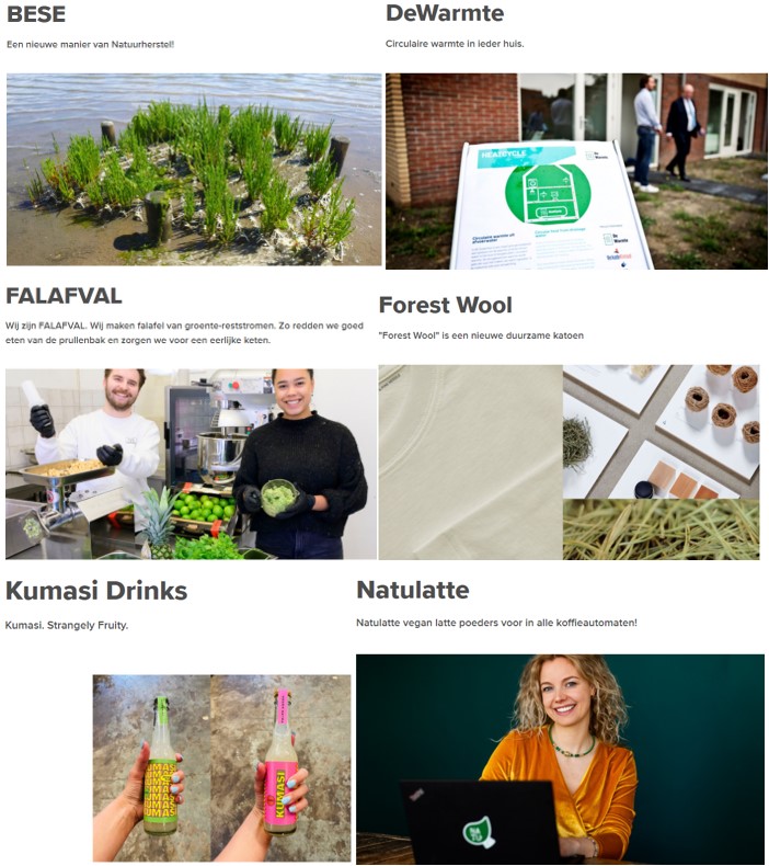 - BESE – helpt waterrijke natuurgebieden herstellen met behulp van biobased, bio-afbreekbare materialen. Mariene ecoloog Malenthe Teunis en haar teamgenoten gebruiken elementen gemaakt van afval uit de patat-industrie (zetmeel) om de natuur te helpen bij het opstarten van jonge planten en dieren. Ze bieden hiermee een milieuvriendelijk alternatief voor vervuilende en permanente materialen zoals plastic en beton.