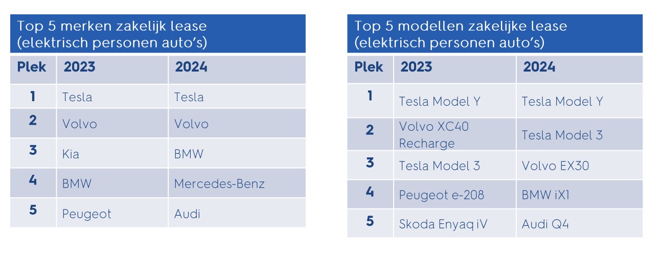 De Tesla Model Y is wederom het populairste elektrische model bij zakelijke leaserijders in 2024. De Tesla Model 3 stijgt naar de tweede plaats. Met een indrukwekkend marktaandeel van 31% in 2024, een stijging van 50% ten opzichte van 2023, versterkt Tesla zijn dominante positie. Andere merken hebben marktaandeel verloren, met uitzondering van de BMW iX1, die stabiel blijft en de hoogste stijger in de top 10 is. Volvo behoudt zijn sterke tweede plek in het merkenklassement, maar er zijn ook zeker een aantal nieuwkomers in de top 5. Denk aan de Audi Q4, Mercedes EQB, Renault Scenic, Volvo EX40, Mercedes EQA en Hyundai KONA hun intrede doen in de top 10. Dit gaat ten koste van onder andere de Peugeot e-208 en Kia Niro die uit de ranglijst vallen.