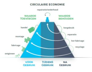 De gebeurtenissen van het voorbije jaar hebben de gebreken van ons huidige economische model onder een vergrootglas gelegd. De Covid-19 crisis heeft duidelijk gemaakt dat de toeleveringsketens van het oude lineaire model van productie en consumptie snel overhoop kunnen worden gehaald. De circulaire economie of kringloopeconomie biedt een alternatief voor de lineaire economie, waarin grondstoffen worden ontgonnen, gebruikt en weer weggegooid. In een circulaire economie worden materialen en producten niet verspild en worden ze opnieuw ingezet in het systeem. Het gaat erom de waarde van materialen en hulpbronnen zo lang mogelijk te behouden in de economie en ook om de hoeveelheid afval zo laag mogelijk te houden. (zie figuur)