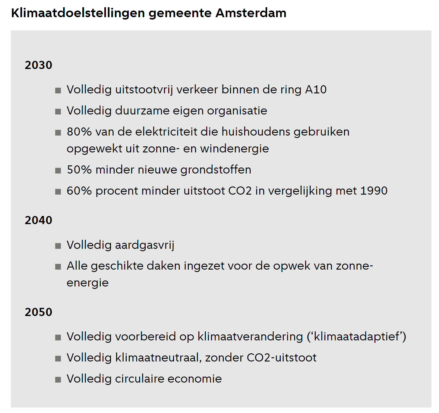 Amsterdam wil als hoofdstad een voorloper in verduurzaming zijn. Echt vlotten wil het nog niet. Daarom presenteert wethouder Zita Pels deze week een nieuw pakket maatregelen ook voor bedrijven. Amsterdam gaat het klimaatbeleid versnellen. Bijvoorbeeld door: