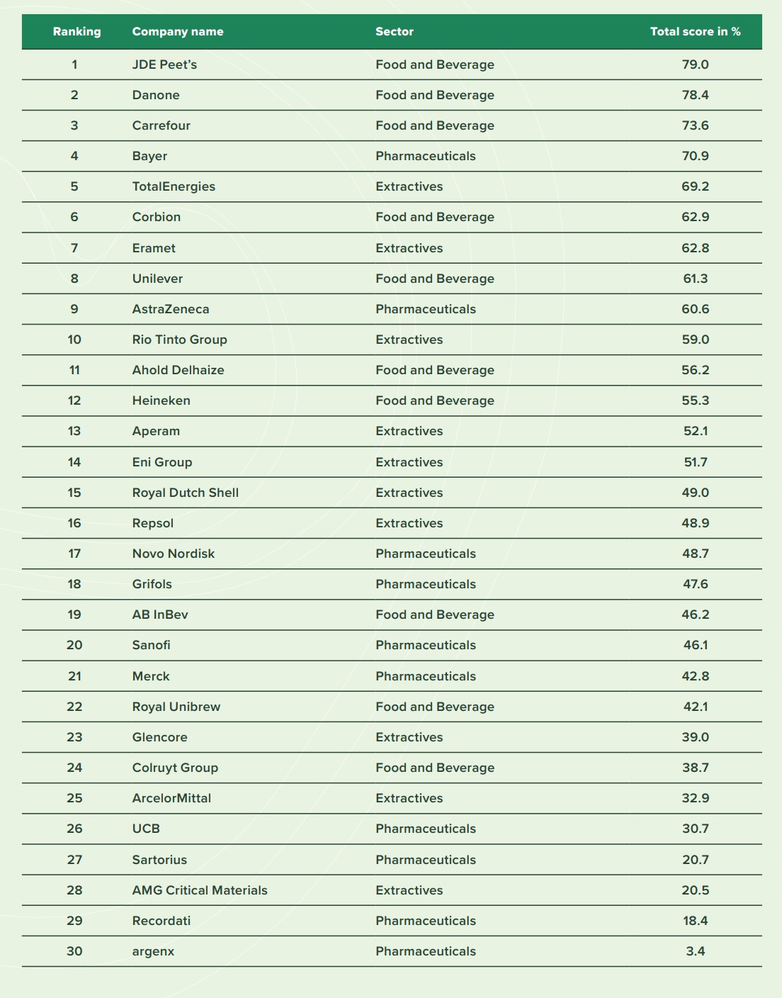 JDE Peet’s voert de ranglijst voor 2025 aan met een score van 79%, gevolgd door Danone (78,4%) en Carrefour (73,6%). Aan de onderkant van de lijst scoren meerdere bedrijven minder dan 25%, wat een grote kloof tussen koplopers en achterblijvers blootlegt.