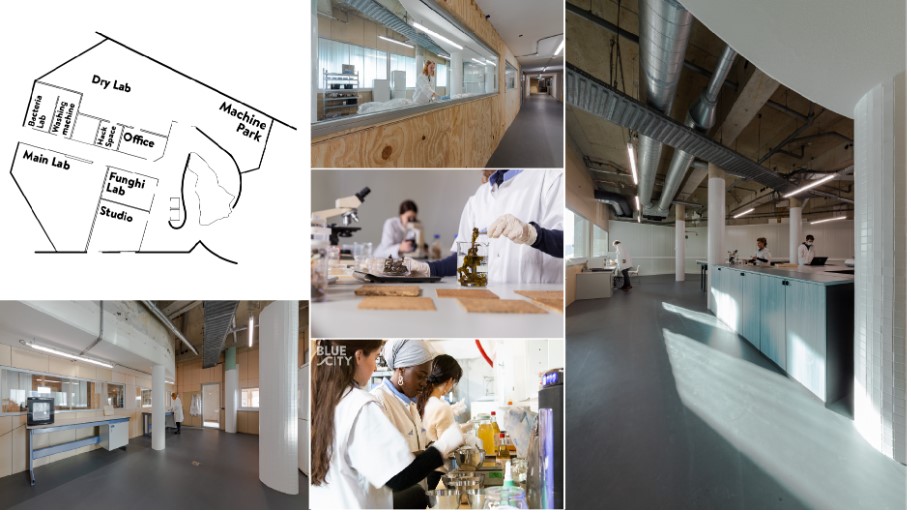 Met steun van partners als Rabobank Rotterdam, Stichting DOEN en Gemeente Rotterdam realiseerden Binnendijk en haar team een ruim 2000 m² grote ruimte, bestaande uit een lab om te experimenteren met schimmels, een bacterieel lab en een algemeen lab voor licht biochemisch werk, aangevuld met een werkplaats met 3D printers, een CNC-frees en houtbewerkingsmachines. “Die combinatie van ruimtes is uniek en essentieel,” aldus Binnendijk: “In de de labs kweek je materiaal, in de werkplaats zet je dat om in een product. Zo kun je je prototype ontwikkelen en testen.” In samenwerking met Hogeschool Rotterdam bereidt het BlueCity Lab bovendien studenten vanuit een circulaire praktijksituatie voor op de arbeidsmarkt van de toekomst.
