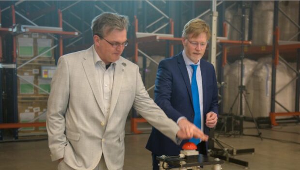 Arnold de Jong, CEO van de Fritom Group (rechts op de foto), en collega Albert Medendorp, de BREEAM-projectleider, drukten hier samen op een rode knop waarmee een indrukwekkende lasershow in gang werd gezet. Vervolgens werden de bedrijfshoogtepunten sinds 1917 op spectaculaire wijze op de stellingen geprojecteerd.