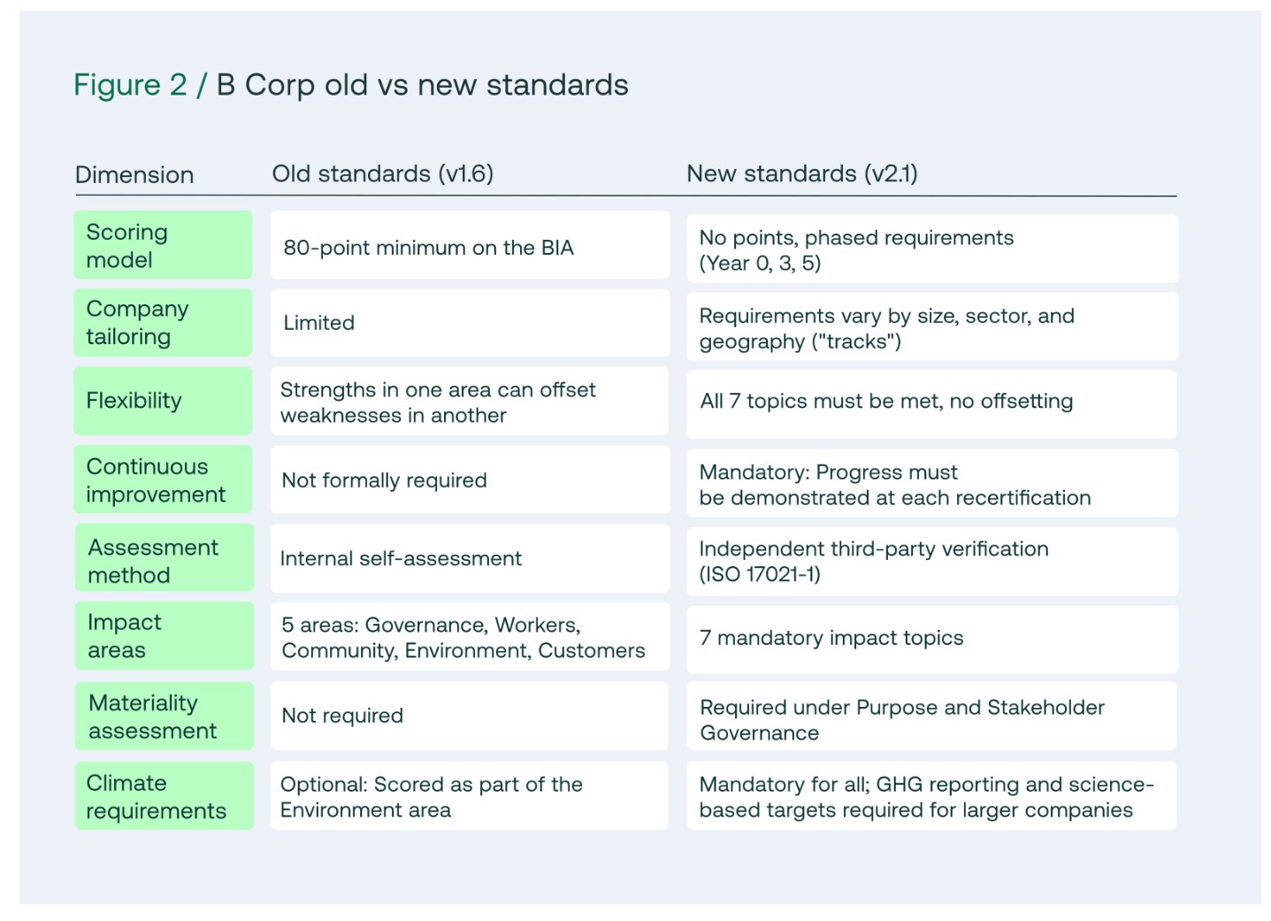- De oude B Corp-standaarden vereisten 80 punten over 5 impactgebieden, zonder minimum voor een enkel gebied. De nieuwe standaarden vereisen minimale prestaties op alle 7 verplichte impactthema’s. Selectief scoren is niet meer mogelijk.
