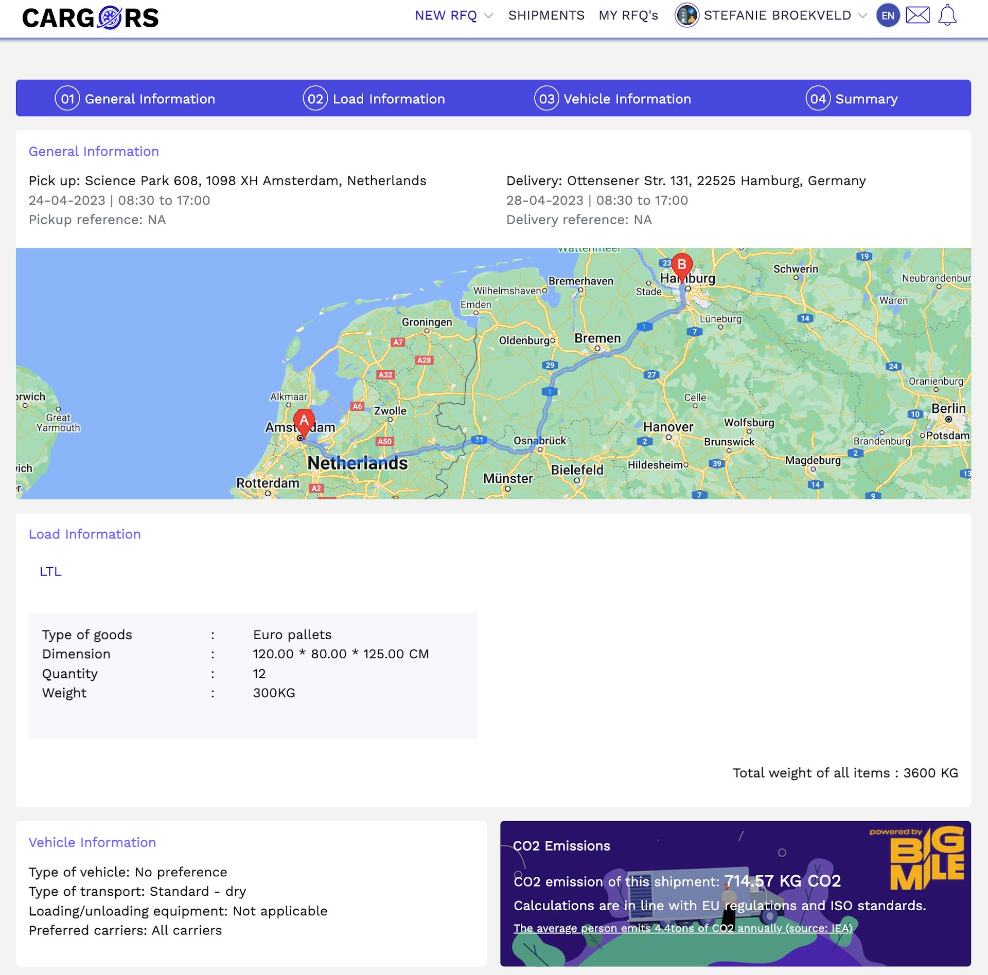 Cargors is in zijn portal niet alleen transparant over prijzen, maar voegt daar nu dus ook informatie over CO2-uitstoot per zending aan toe. De verlader geeft de opdracht in en binnen enkele seconden geeft het systeem enkele alternatieven en kan een zending direct worden aangemaakt. De verwachte CO2-uitstoot wordt ook meteen weergegeven.
