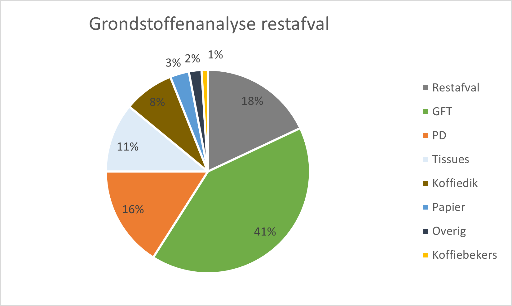 De grondstoffenanalyse legde bloot dat er drie grote stromen in het restafval zitten die goed verwerkt kunnen worden tot nuttige materialen. Meer dan 40% van het gewicht van de afvalbak bestond uit GFT (etensresten), 10% uit tissues en 15% plastic. Tissues en plastics nemen vooral ook veel volume in.