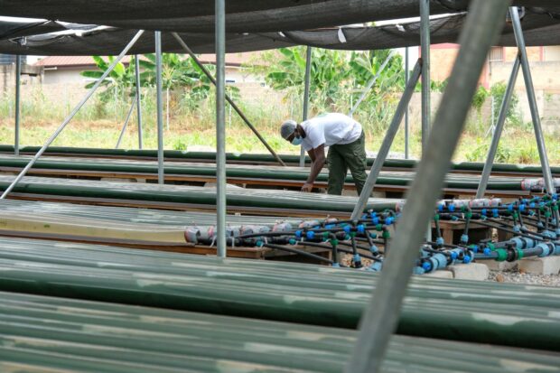 - Ruben en Patricia spreiden de spirulina uit op netten, voordat het de droogruimte in gaat.
