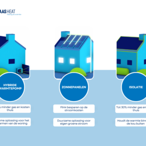 De eerste optie om te besparen op de energierekening is door een hybride warmtepomp aan te schaffen. Een hybride warmtepomp is eigenlijk het hulpje van de cv-ketel. Deze pomp haalt warmte uit de buitenlucht om daarmee jouw huis te verwarmen. Daardoor brandt je huidige cv ketel veel minder en bespaar je veel gas, CO2 en kosten! De hybride warmtepomp heeft een kleine binnenunit en een buitenunit. De binnenunit komt naast de huidige CV ketel te hangen. Door dus een hybride warmtepomp te installeren zorg je ervoor dat je huis behaaglijk warm is en je energie rekening betaalbaar blijft.Nu denk je misschien; een hybride warmtepomp aanschaffen kost natuurlijk een godsvermogen? Niet als je als werkgever je werknemer het Hybride Warmtepomp Plan aanbiedt welke jou als werkgever niks kost.