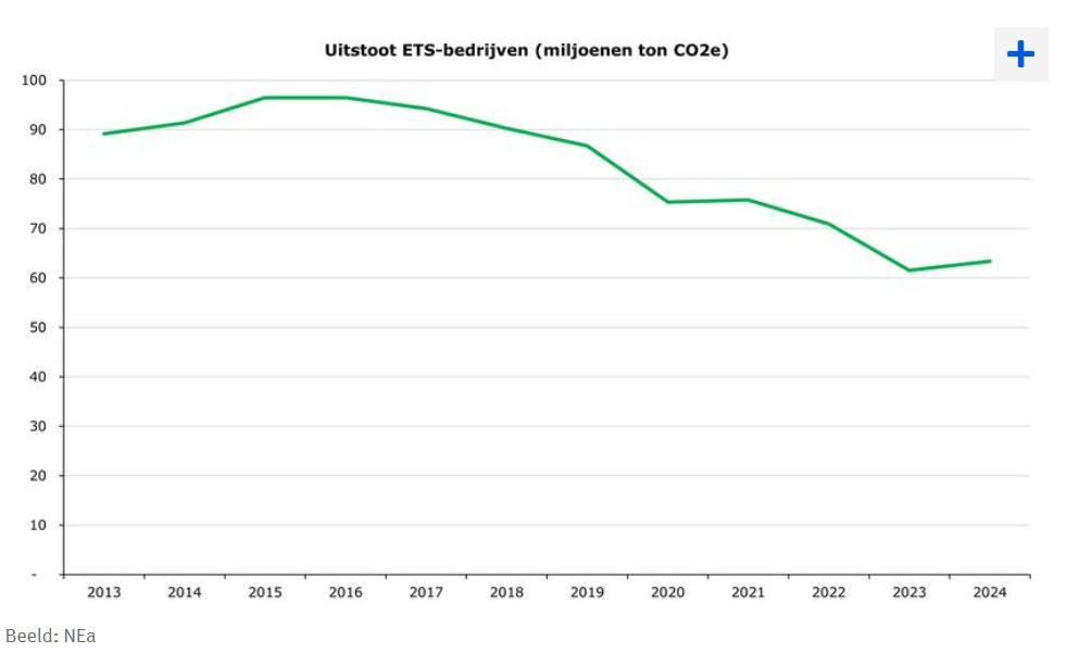 Nederlandse bedrijven in het Europese emissiehandelssyteem (EU ETS) hebben in 2024 zo’n 1,8 miljoen ton CO2 meer uitgestoten dan in 2023. Deze 2,9% stijging volgt op 7 jaar van forse dalingen, waarin alleen in 2021 een lichte stijging was na het eerste covid-jaar. De uitstoot van alle ETS-bedrijven in heel Europa is wel gedaald, met 5%.