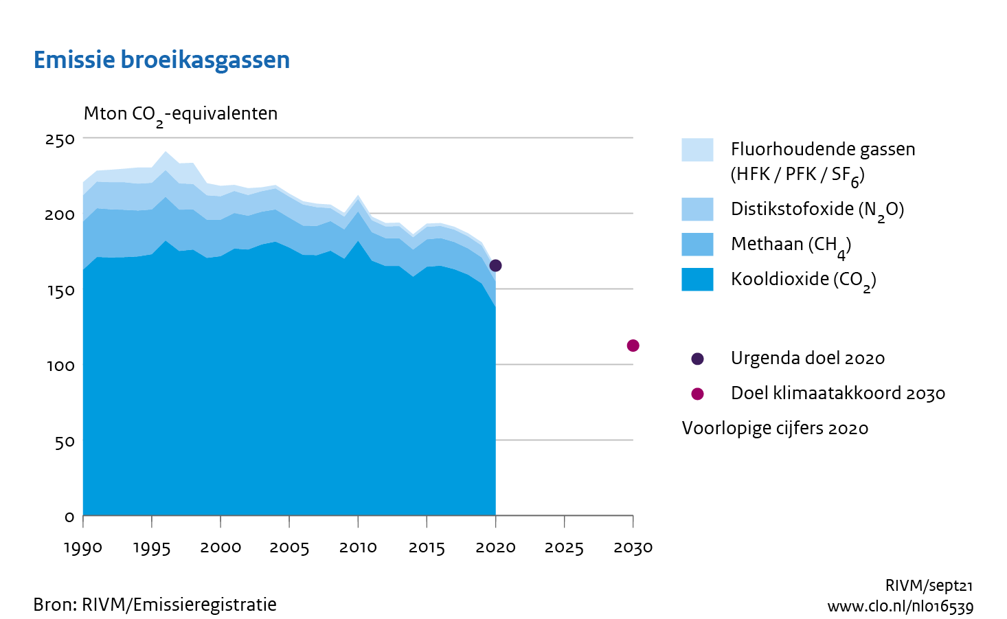 In 2020 was de uitstoot van broeikasgassen 9 procent lager dan in 2019. In totaal is de uitstoot nu 25,4 procent lager dan in 1990. Dit volgt uit de voorlopige cijfers die RIVM en CBS Centraal Bureau voor de Statistiek vandaag publiceren op emissieregistratie.nl. Ook de overige luchtverontreinigende stoffen laten een daling zien. Alleen de uitstoot van ammoniak stijgt in deze voorlopige cijfers licht ten opzichte van 2019. Definitieve cijfers over 2020 zullen begin 2022 beschikbaar komen. Het betreft dan een actualisatie van de voorlopige cijfers, op basis van actuelere statistieken die pas later in het jaar beschikbaar komen. De afname van de uitstoot van broeikasgassen ten opzichte van 1990 zal waarschijnlijk uitkomen tussen de 24 en 27 procent. Het zogeheten Urgendadoel is een minimale afname van 25 procent tussen 1990 en 2020.