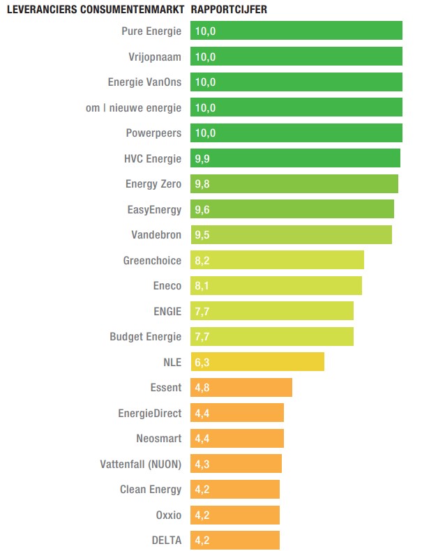 De Stroomranking maakt zichtbaar welke stroomleveranciers echt groen zijn en welke niet. Vijf van de 34 aanbieders op de consumentenmarkt krijgen een 10. Elf een 8 of hoger.