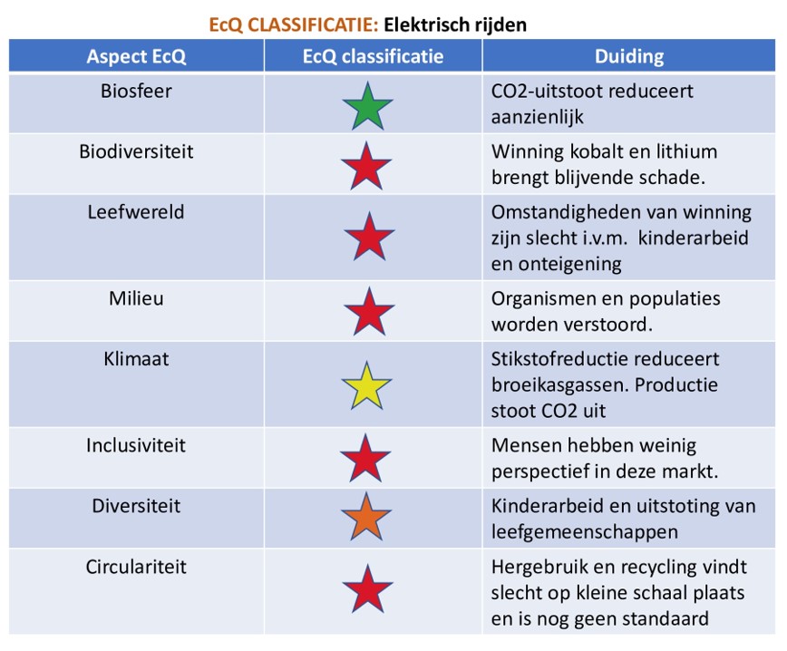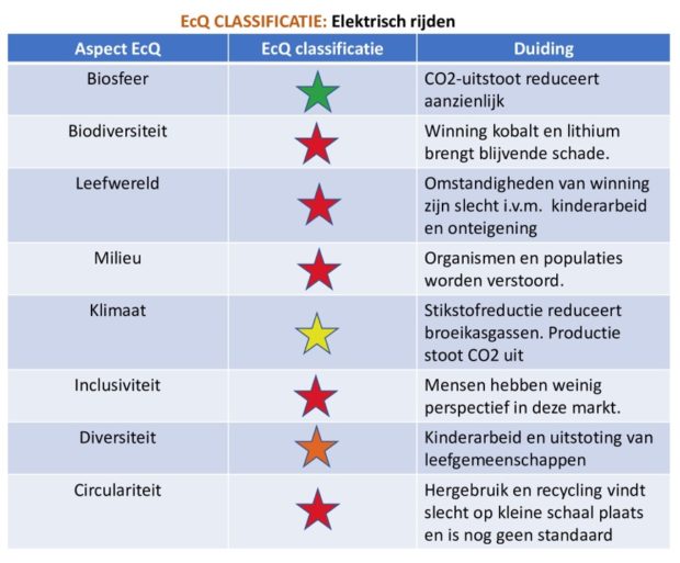 Het is een boek waarin ik niet met een vingertje wijs naar wat fout gaat. Ik maak duidelijk en probeer de lezer bewust te maken dat het anders kan. Ik lanceer ook een methode om integraal met onze ecologie om te gaan, namelijk de ecologische sterren classificatie. Als ik die classificatie toepas op mijn eerdere voorbeeld van elektrisch rijden dan komt er het volgende uit: