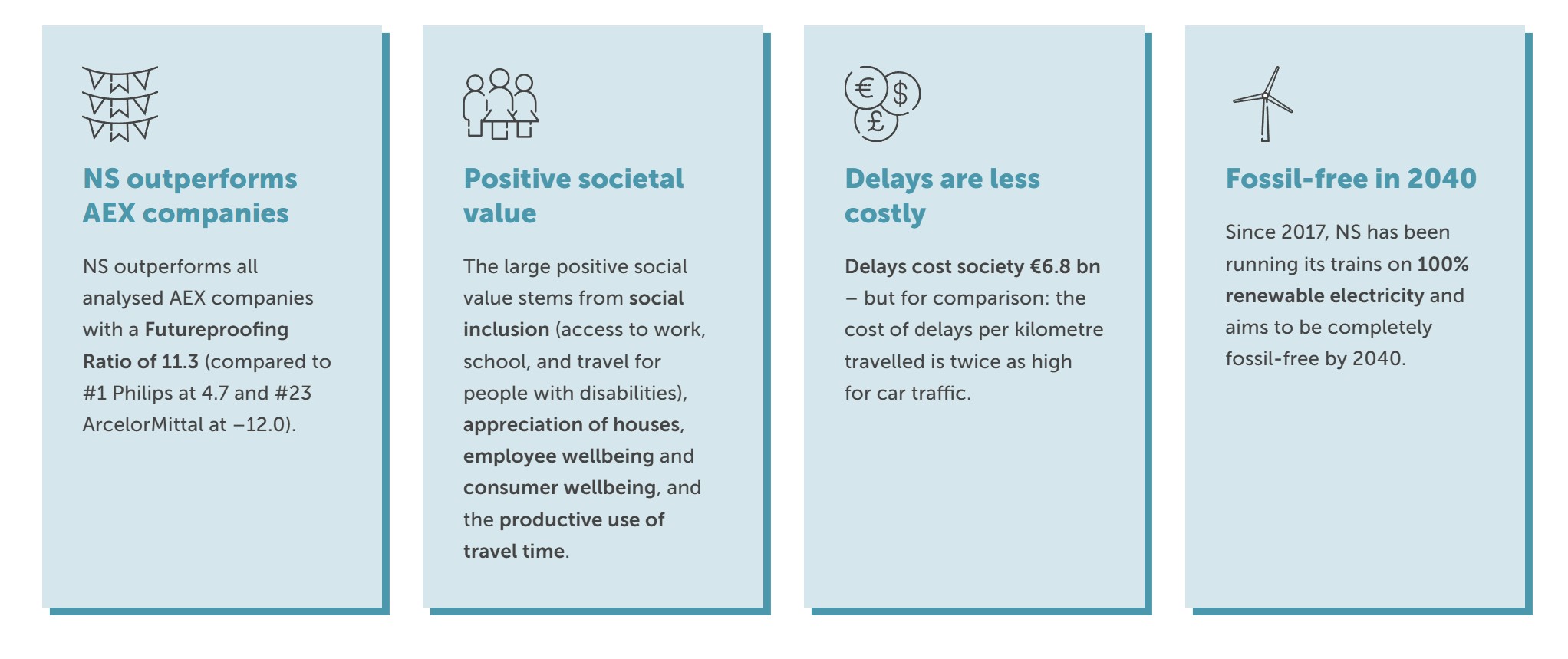 De Nederlandse Spoorwegen (NS) heeft een geïntegreerde waarde van € 72,8 miljard – 11,3 keer de financiële waarde van € 6,4 miljard. Dit betekent dat NS aanzienlijk beter presteert dan alle 23 AEX-bedrijven die eerder in de AEX Futureproof Index zijn opgenomen. Dit blijkt uit een nieuw onderzoek van de Rotterdam School of Management, de Erasmus Universiteit en strategisch bureau ftrprf. Het onderzoek werd geleid door professor Dirk Schoenmaker (RSM) en econometrist Wander Marijnissen (ftrprf) en maakte gebruik van de integrale waardemethodiek ontwikkeld door Schoenmaker en professor Willem Schramade (Nyenrode). Het onderzoek combineert de financiële, maatschappelijke en ecologische waarde van de bedrijven tot één getal: integrale waarde. Als een bedrijf een totale maatschappelijke bijdrage levert die groter is dan de financiële waarde, noemen de professoren dat bedrijf toekomstbestendig.
