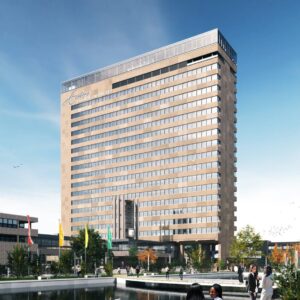 In de uitvraag voor de renovatie daagde DNB aannemers uit om met duurzame, circulaire oplossingen te komen. Een van de wensen hierbij was om de ronde toren bij het kantoor een tweede leven te geven. De ‘Satelliet’ kreeg uiteindelijk een nieuwe bestemming, maar het proces kende uitdagingen. “Daarbij was het onze verantwoordelijkheid om te zorgen dat betrokken bedrijven niet in de problemen kwamen, omdat wij ‘leuk met elkaar wilden pionieren’”, vertelt Van Leuken.