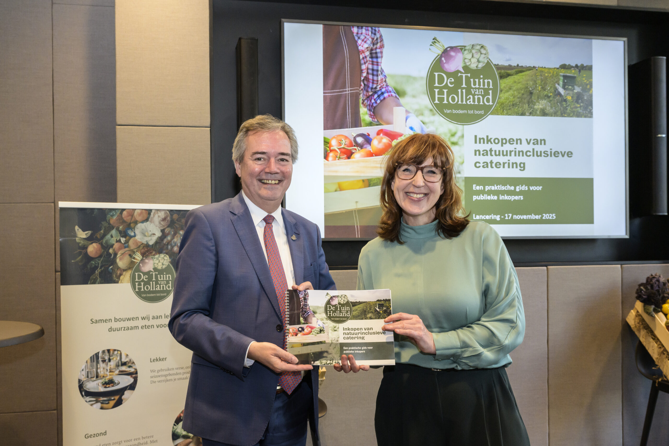 - Den Haag, 17-11-2025, lancering gids ‘Inkopen van natuurinclusieve catering’ van de provincie Zuid Holland op het Provinciehuis.Het eerste exemplaar van de gids wordt aangeboden aan gedeputeerde Meindert Stolk