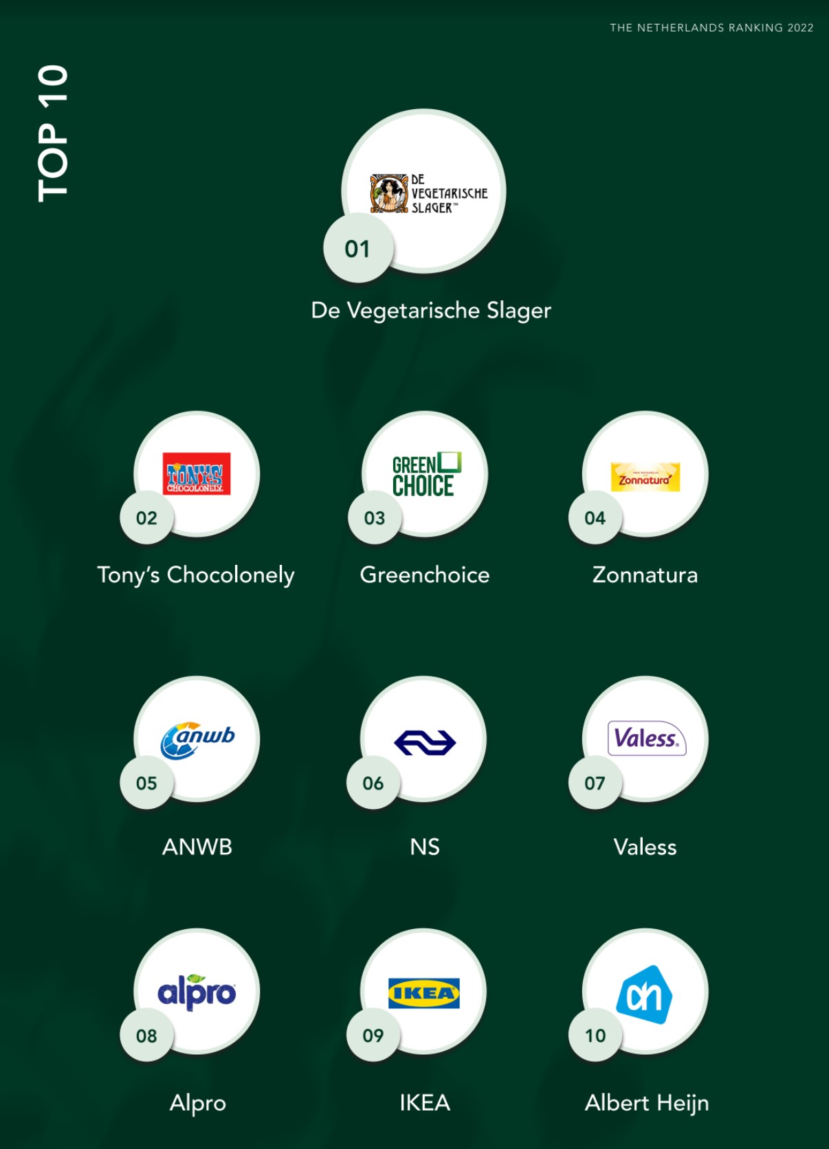 Nadat Tony’s Chocolonely de afgelopen 4 jaar de leiding nam in de Sustainable Brand Index, wordt De Vegetarische Slager dit jaar door Nederlandse consumenten gezien als het meest duurzame merk. Tony’s Chocolonely staat vlak achter De Vegetarische Slager op de tweede plaats en Greenchoice eindigt op de derde plaats. Dit is het resultaat van de Sustainable Brand Index, die vandaag voor de zesde keer wordt gepresenteerd, waarin consumenten de meest duurzame merken in Nederland aanwijzen. Vorig jaar zat De Vegetarische Slager Tony’s al op de hielen, dit jaar kwam De Vegetarische Slager als overall winnaar uit de bus.