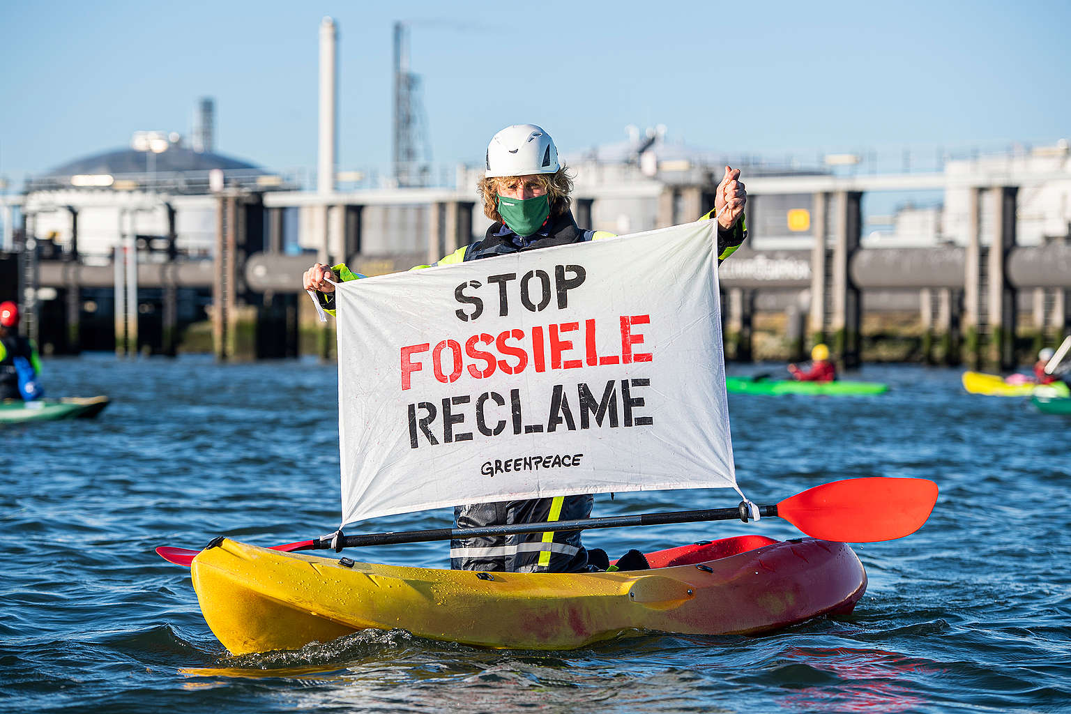 More than 80 Greenpeace Netherlands activists from 12 EU countries are using fossil fuel ads from all over Europe to block the entrance to Shell’s oil refinery. The peaceful protest comes as over 20 organizations launched a European Citizens’ Initiative (ECI) petition today, calling for a new law that bans fossil fuel advertising and sponsorship in the European Union.