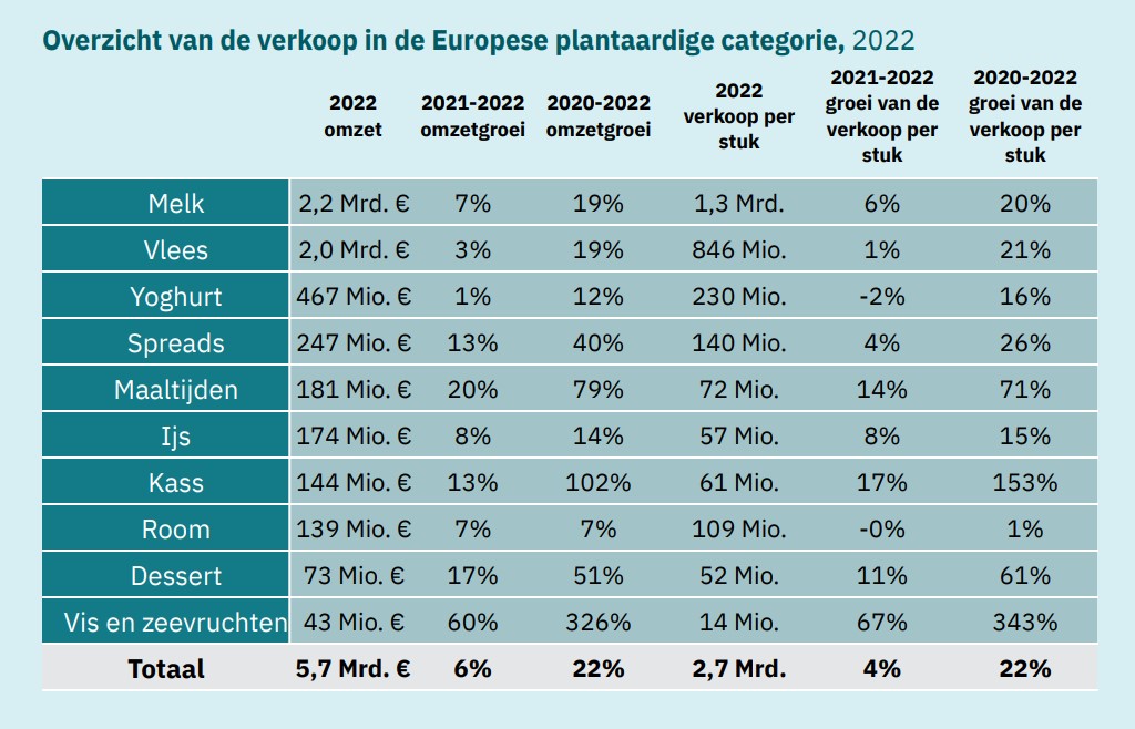 Uit verkoopgegevens van NielsenIQ met betrekking tot 13 Europese landen blijkt dat de verkoop van plantaardige voedingsmiddelen in 2022 met 6% is gestegen – en met 22% sinds 2020 – tot 5,7 miljard euro. De wereldwijde verschuiving naar plantaardige voeding heeft een revolutie teweeggebracht in de voedingsindustrie, waarbij grote voedingsproducenten en detailhandelaren de verandering omarmen. In Europa is de verkoop van plantaardige voedingsmiddelen in de detailhandel de afgelopen jaren sterk gestegen doordat nieuwe producten en innovaties op de markt zijn gekomen, waardoor meer consumenten een nieuwe generatie plantaardig vlees, zeevruchten, eieren en zuivelproducten kunnen kopen die qua smaak, prijs en gemak kunnen concurreren met dierlijke producten.