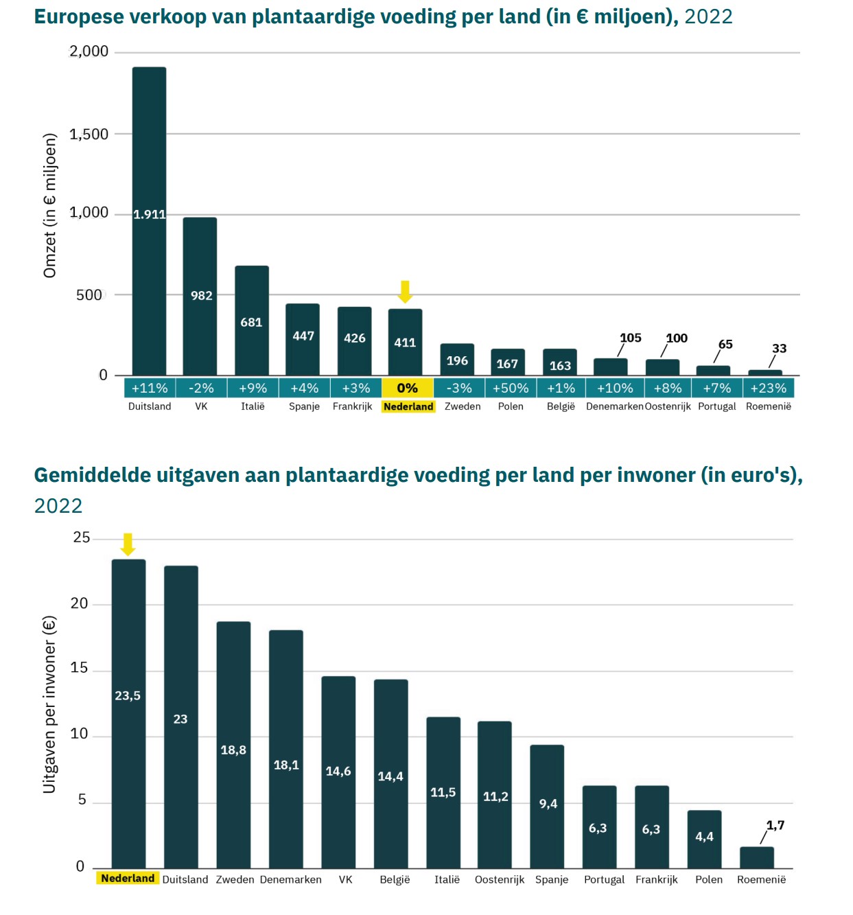 De Nederlandse consumentenmarkt voor plantaardige voedingsmiddelen is de zesde grootste in Europa. Maar Nederlandse consumenten hebben de hoogste consumptie van plantaardige voedingsmiddelen per inwoner. Dit is in lijn met de algemene verkooptrends in Nederland, waar de verkoop van plantaardige voedingsmiddelen tussen 2020 en 2022 met 9% groeide tot 441,4 miljoen euro. Plantaardig vlees (vleesvervangers) is de meest volwassen categorie van plantaardige producten in Nederland, hoewel de verkoop hiervan in 2022 daalde. De marktwaarde van plantaardige melk blijft stijgen, met een groei van 14% tussen 2020 en 2022. Een van de minst ontwikkelde, maar snelst groeiende categorieën is plantaardige kaas.