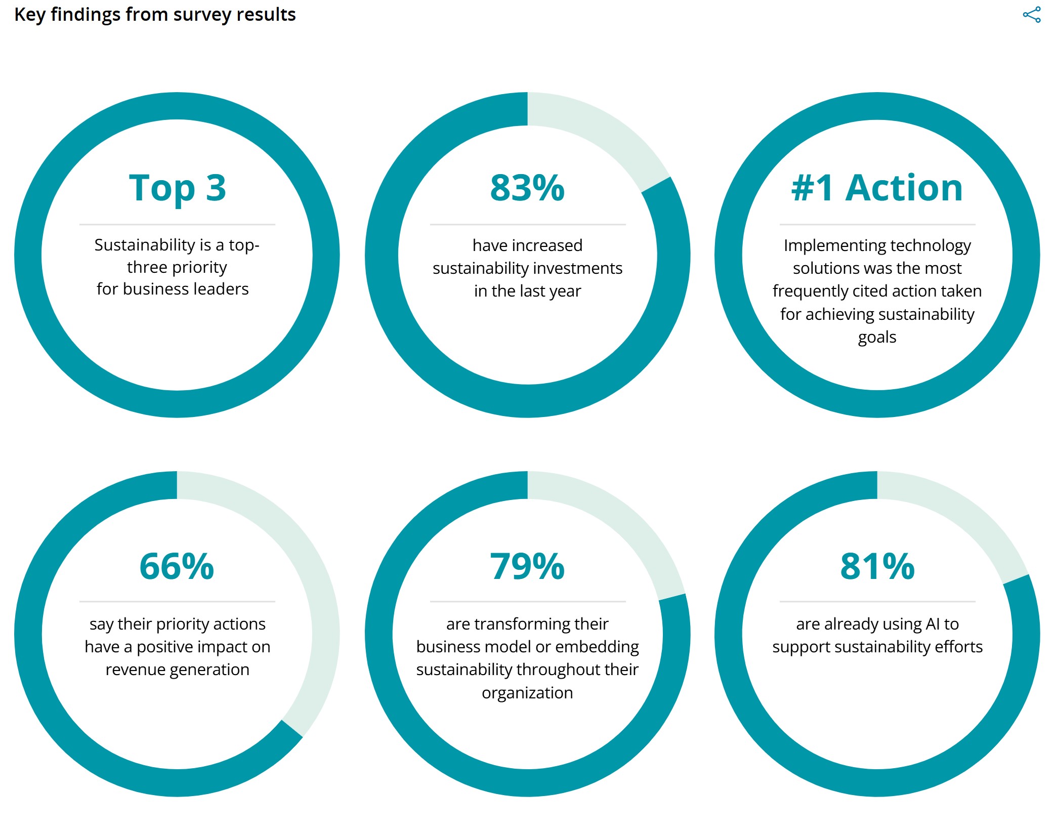 De adoptie van technologie, met name kunstmatige intelligentie (AI), lijkt een steeds grotere rol te spelen. Eenentachtig procent van de respondenten gaf aan AI al te gebruiken om de duurzaamheidsinspanningen van hun bedrijf te bevorderen, met toepassingen op het gebied van monitoring en rapportage, scenarioanalyse, productinnovatie en operationele efficiëntie.