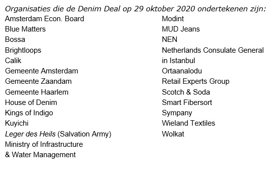 Deze Denim Deal start als een samenwerkingsverband van koplopers op de Nederlandse denim markt samen met internationale partners, de gemeenten Amsterdam en Zaanstad en House of Denim. De Denim Deal loopt drie jaar. Aan het einde van ieder jaar wordt gerapporteerd welke activiteiten partijen hebben ondernomen, welke resultaten geboekt zijn en welk effect deze hebben gehad op het bereiken van het doel. Nieuwe partijen die ook mee willen doen, kunnen zich nog aansluiten. Meer informatie ook over aansluiten bij de Denim Deal is te vinden op www.denim-deal.nl.