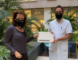 Woensdagmiddag (25 november) overhandigden Jolijn Creutzberg en Chimene Kouakou het 50.000e Vanhulley mondkapje aan Diederik Gommers, voorzitter van de Nederlandse Vereniging voor Intensive Care, en inmiddels wereldberoemd in Nederland. Kouakou is een van de twintig deelnemers bij social enterprise Vanhulley, het naaiatelier dat in coronatijd razendsnel omschakelde naar de productie van mondkapjes.