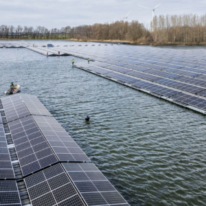 Joash Wijbenga: “Een voordeel is dat het zonnepark praktisch naast het hoogspanningsstation van Tennet ligt, waardoor we geen lange kabels hoeven te graven om het park aan te sluiten op het stroomnet. Het drijvende park is verder aangelegd in een zogenaamde oost-west-opstelling, met panelen gericht naar het oosten en naar het westen. Hierdoor realiseren we een gelijkmatige opwek van zonne-energie en minder hoge pieken rond het middaguur. Dat is beter voor de belasting van het elektriciteitsnetwerk.”