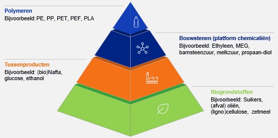 Overzicht van biobased grondstoffen, tussenproducten, en bouwstenen.