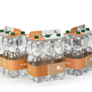 DS Smith Lift Up is ontworpen om een antwoord te bieden op de duurzaamheidsvraagstukken van de drankenindustrie. Die vraagstukken worden gedreven door consumentengedrag, veranderende Europese wetgeving en toenemende druk van retailers naar vermindering van plastic in supermarkten. Dit volledig recyclebare, op papiervezel gebaseerde alternatief, vervangt de plastic krimpfolie gebruikt bij multi-packs plastic flessen. Deze innovatieve 2-delige oplossing is ontwikkeld met Krones. Het product bestaat uit een golfkartonnen clip en een papieren band. Krones is een toonaangevende machinefabrikant voor de drankenindustrie. Met Krones kan de compatibiliteit met bestaande hogesnelheidslijnen worden gegarandeerd. Ontworpen voor 4 en 6 PET-flessen van 1 tot 2 liter, is het assortiment nu uitgebreid voor verschillende flesformaten en samenstellingen.