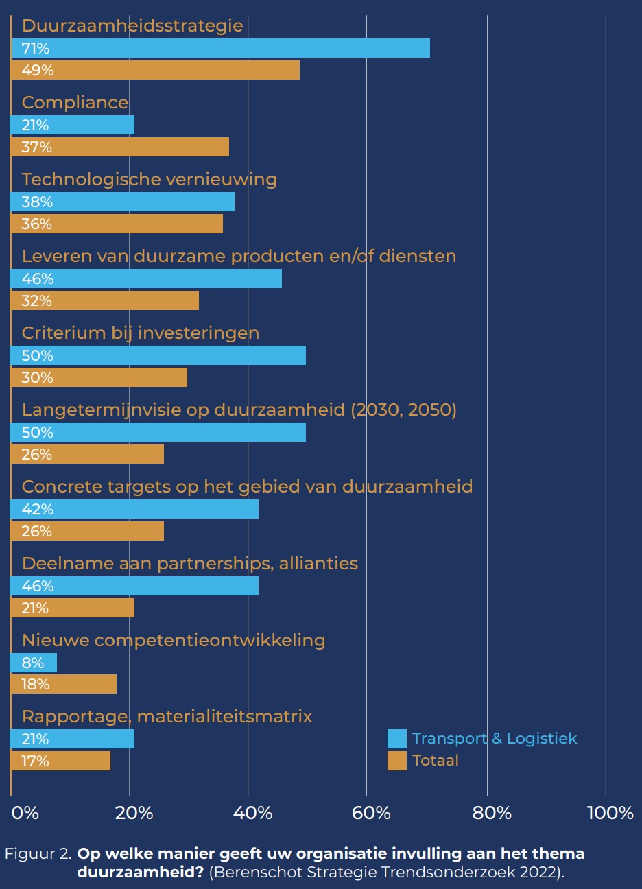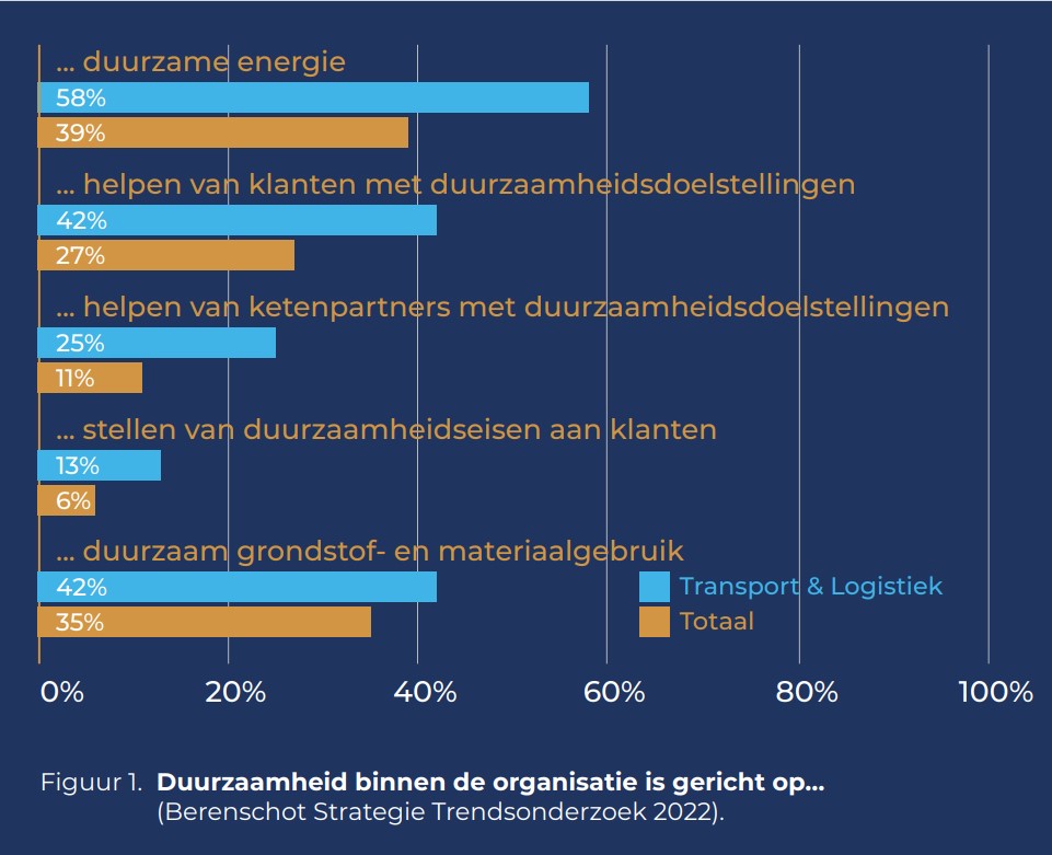 Het Strategie Trendsonderzoek 2022 van Berenschot laat zien dat ook consumenten en investeerders steeds hogere eisen stellen op het gebied van verduurzaming. Zo wordt de reis die een product aflegt een steeds belangrijkere factor in de afweging tussen het wel of niet aanschaffen ervan. Opvallend is dat de druk om te verduurzamen ook komt van de grote verladers. Wel geeft de sector duidelijk aan in gesprek te willen gaan om samen met klanten en ketenpartners de verduurzamingsopgave op te pakken.