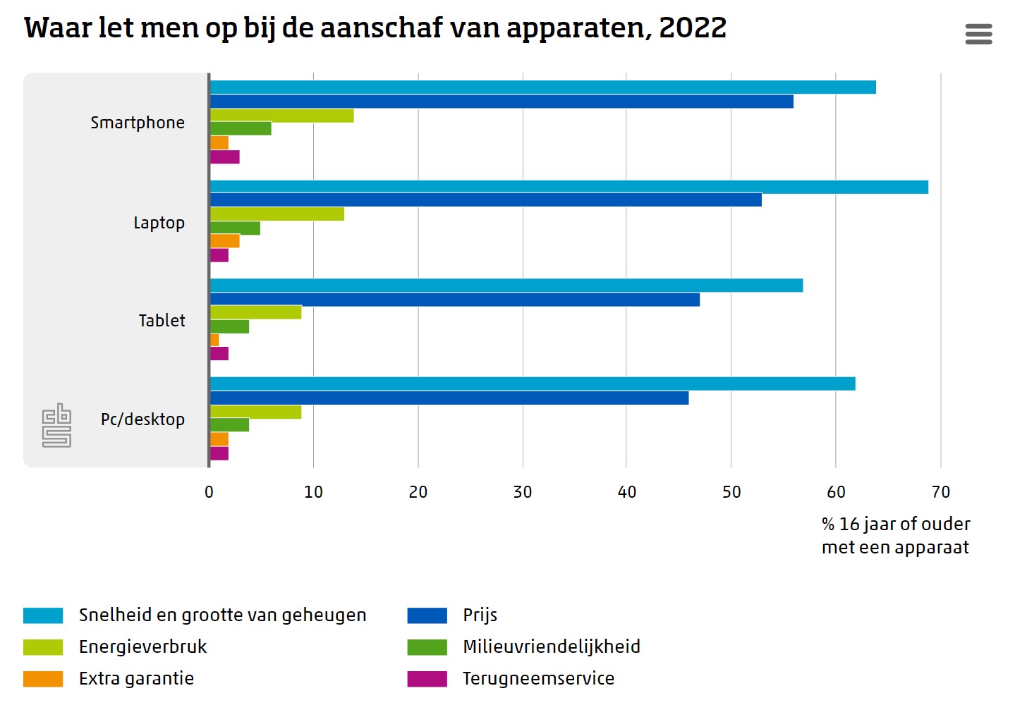 Grofweg 60 á 70 procent let bij de aanschaf van een nieuw apparaat vooral op de snelheid en geheugencapaciteit. Ongeveer de helft vindt de prijs het belangrijkst. Duurzaamheidsoverwegingen spelen bij de aanschaf een ondergeschikte rol. Ongeveer 10 procent kijkt naar het energieverbruik, 5 procent let op de milieuvriendelijkheid van het nieuwe apparaat.
