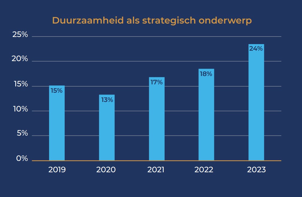 In de 2023-editie van het jaarlijkse Berenschot Strategie Trendsonderzoek blijkt dat duurzaamheid van steeds groter strategisch belang is. Bij 24% van de bedrijven staat duurzaamheid op de strategische agenda in de boardroom (2022: 18%). Uit het onderzoek blijkt ook dat een ruime meerderheid van de bedrijven nog niet volledig voorbereid is op de komende verplichting voor duurzaamheidsverslaggeving (CSRD). Berenschot brengt het onderzoek sinds 2007 uit, het is één van de langst lopende onderzoeken in Nederland op het vlak van strategie.