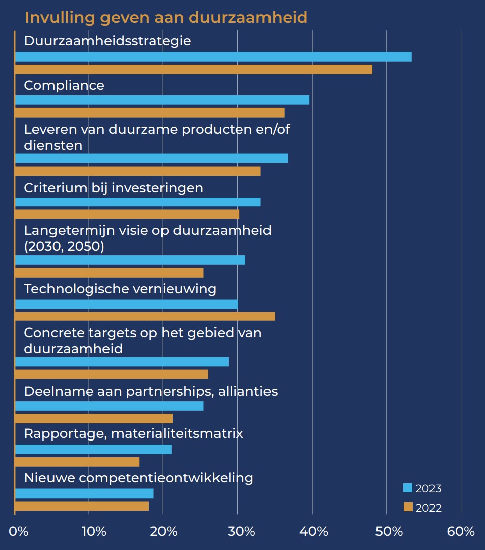 Duurzaamheid is doorgedrongen tot de kern van het strategieproces. De strategische impact van het thema duurzaamheid neemt namelijk toe, en organisaties geven hieraan steeds meer invulling. Ook dit jaar zien we dat duurzaamheid en maatschappelijk verantwoord ondernemen weer worden besproken in de boardroom. Duurzaamheid heeft op de strategische agenda een flinke sprong gemaakt dit jaar van 18% in 2022 naar 24%.