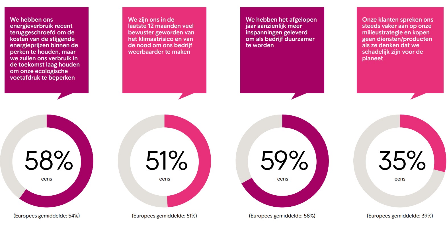 Ondanks dat de economische omstandigheden ervoor zorgen dat bedrijven momenteel weinig tot niet investeren, is duurzaamheid iets waar bedrijven wél in willen investeren. Zo hebben de stijgende energieprijzen voor bedrijven in Nederland zelfs een positieve uitwerking voor dit thema. Ruim de helft (58%) zegt namelijk het afgelopen jaar aanzienlijk minder energie verbruikt te hebben om de kosten te beheersen. Dit is meer dan het Europese gemiddelde (54%). Daarnaast is 45 procent van de bedrijven zich veel bewuster geworden van de sociale impact die de organisatie maakt en van de noodzaak om ervoor te zorgen dat er op een maatschappelijk verantwoorde manier wordt gewerkt.