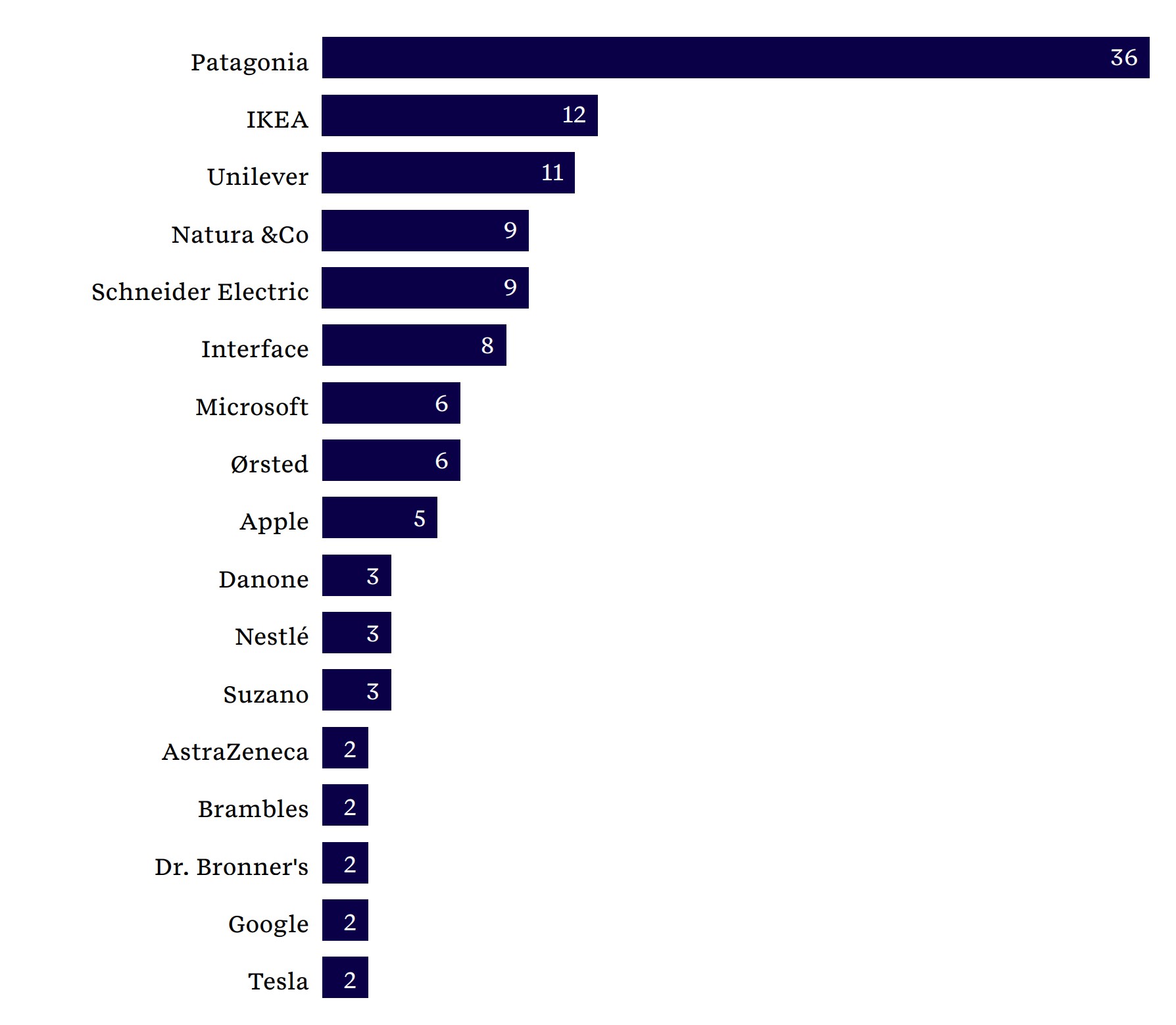 De perceptie van leiderschap blijft stabiel maar genuanceerd. WWF blijft koploper onder ngo’s, gevolgd door Greenpeace, United Nations Global Compact, The Nature Conservancy en het World Resources Institute. Pantagonia behoudt zijn positie als koploper op het gebied van duurzaamheid, op de voet gevolgd door IKEA, Unilever en Natura & Co. Ondertussen krijgen bedrijven zoals Schneider Electric, Microsoft, Interface en Ørsted erkenning in specifieke regio’s.