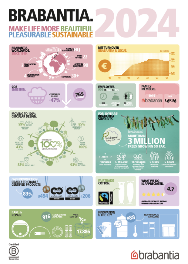 Brabantia blijft investeren in duurzaamheid met certificeringen zoals B Corp en Cradle-to-Cradle. Daarnaast heeft het bedrijf in de afgelopen jaren nieuwe stappen gezet — zoals de overstap naar Fairtrade katoen voor strijkplankovertrekken, het vergroten van het gebruik van gerecycled plastic en een verdere toename van het aandeel hernieuwbare energie in de productieprocessen. Dankzij deze inspanningen blijft Brabantia groeien als een verantwoord en toekomstgericht familiebedrijf. Brabantia** streeft in 2035 naar 100% veilig materiaal, 100% schoon afvalwater, 100% hernieuwbare energie, 100% gerecycled productieafval, 100% gerecycled/biobased materialen en 100% recyclebare producten. In 2024 zijn deze doelen weer een stukje dichterbij gekomen: 99% veilig materiaal (+1%), 100% schoon afvalwater, 85% hernieuwbare energie (+18%), 92% gerecycled productieafval, 43% biobased/gerecycled materialen (+10%) en 83% recyclebare producten (-10%). Hoewel de afvalzakken van PE in principe 100% recycleerbaar zijn, worden ze niet meer als zodanig meegerekend. De daling komt dan ook voort uit een bewustere en realistischere benadering: het bedrijf telt ze niet langer mee omdat ze in de praktijk meestal met afval gevuld in de verbrandingsoven terechtkomen.