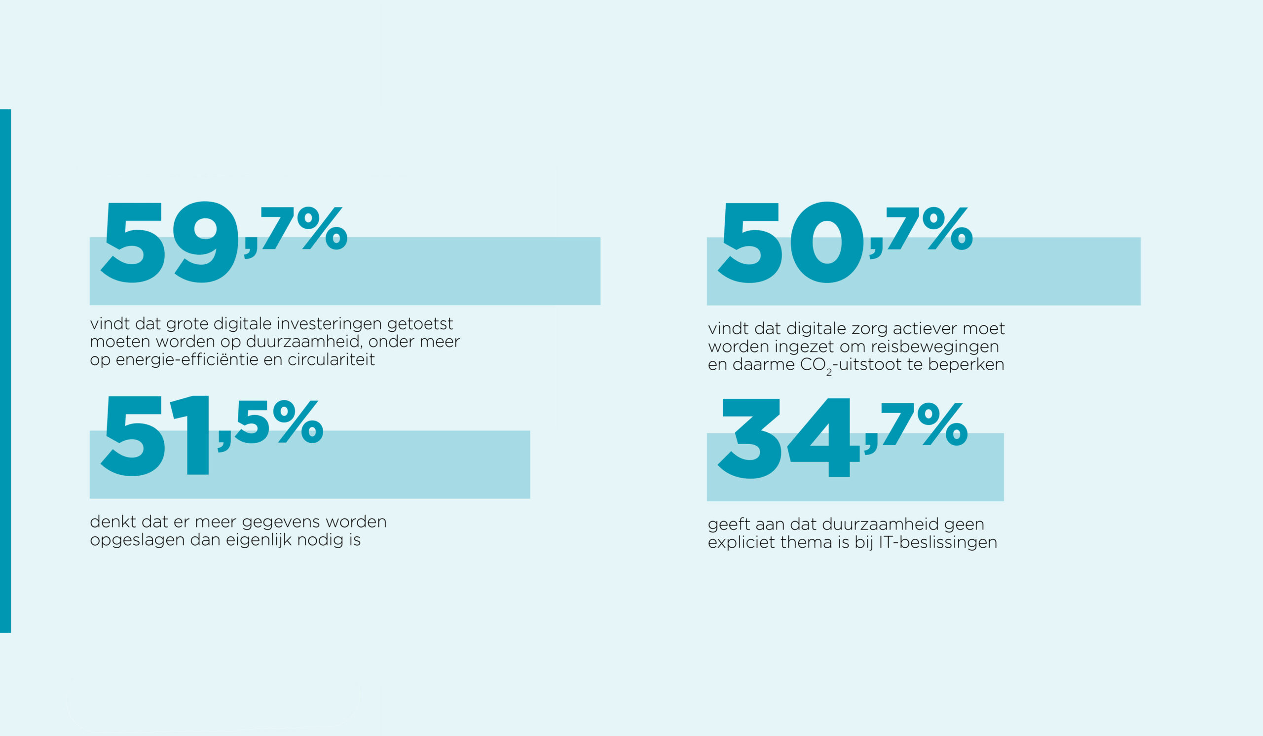 In meer algemene zin constateert bijna de helft (48%) dat de milieu-impact in de zorg wordt onderschat. Verder vindt 36 procent dat duurzaamheid zwaarder zou moeten wegen in IT-inkoop.