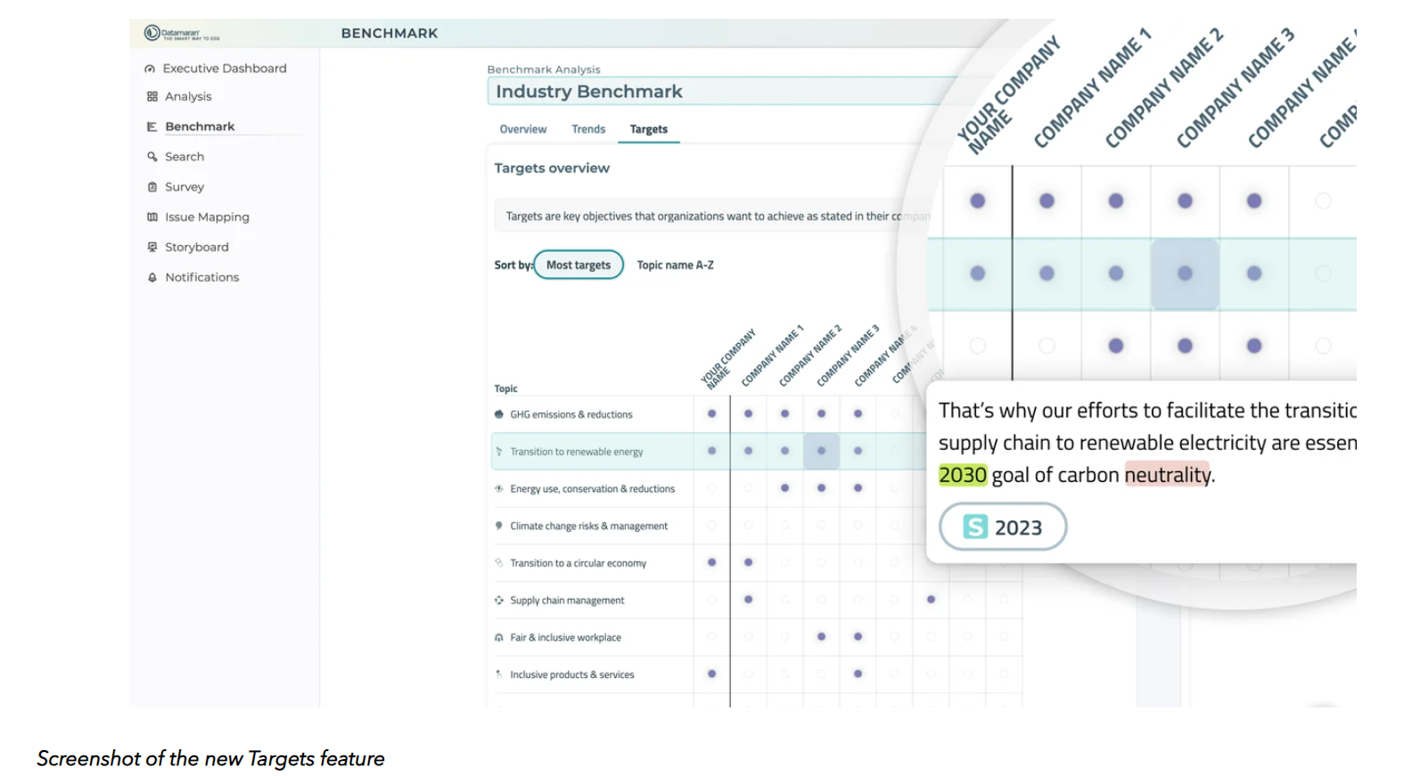 In het eerste kwartaal van 2024 lanceerde Datamaran een nieuwe Targets-functie en verbeteringen aan de dubbele materialiteitsmodule, die marktleidende, datagestuurde Smart ESG-mogelijkheden biedt. Slimme ESG-software geeft bedrijven de beschikking over op bewijs gebaseerde, door AI aangedreven workflowtools om ESG-kwesties te prioriteren, expertise in huis te halen en realtime problemen te monitoren om het bestuur te versterken en de besluitvorming van het C-Suite te informeren.
