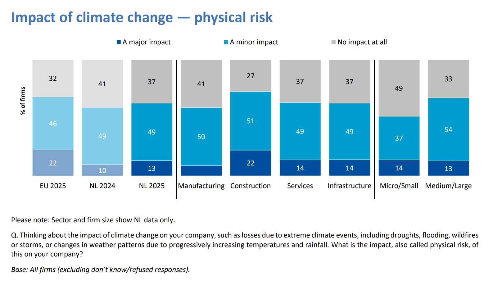 Nederlandse bedrijven zien de groene transitie ook steeds meer als een kans: 39% van de bedrijven geeft aan positief te zijn, tegenover slechts 28% een jaar geleden. De enquête, die meer dan 12.000 Europese bedrijven en meer dan 800 Amerikaanse bedrijven omvat, is tussen april en juli 2025 gehouden en laat ook zien dat 98% van de Nederlandse bedrijven rechtstreeks investeert in maatregelen om de uitstoot van broeikasgassen die klimaatverandering veroorzaken te verminderen. Nederland staat ook in de top 3 van Europa als het gaat om investeringen in energie-efficiëntie. Dit laat zien dat bedrijven stappen ondernemen om de hoge energiekosten aan te pakken, die voor meer dan de helft van hen een investeringsbelemmering blijven.